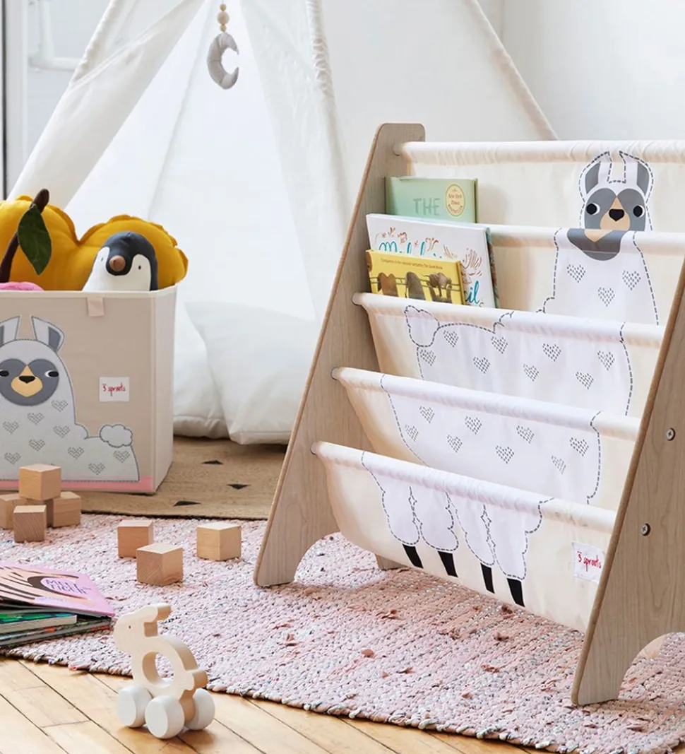 3 Sprouts bogreolen består af fire lommer med masser af plads til børnebøger, malebøger og tegninger på børneværelset. Reolen har en træplade i hver side, som samles med fem rør i midten beklædt af polyesterstof.