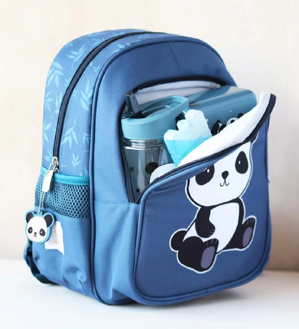 Fin A Little Lovely Company børnehavetaske i navy med en sød panda fortil. På siden er der en hvid applikation med mærkets navn.