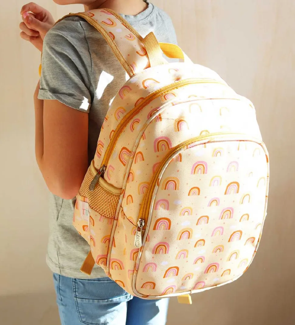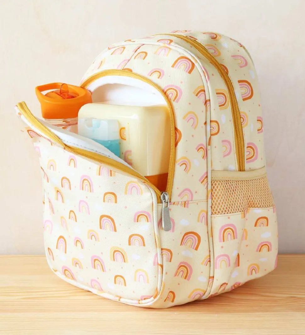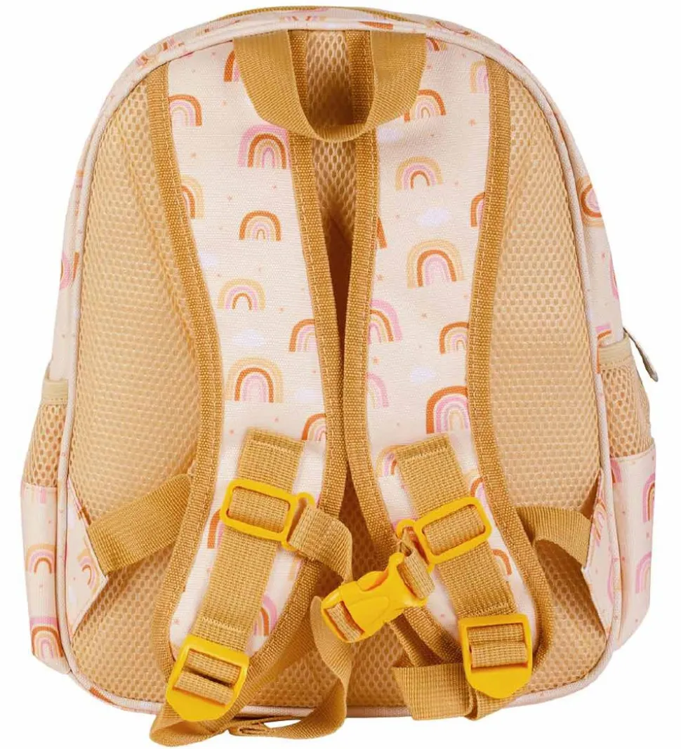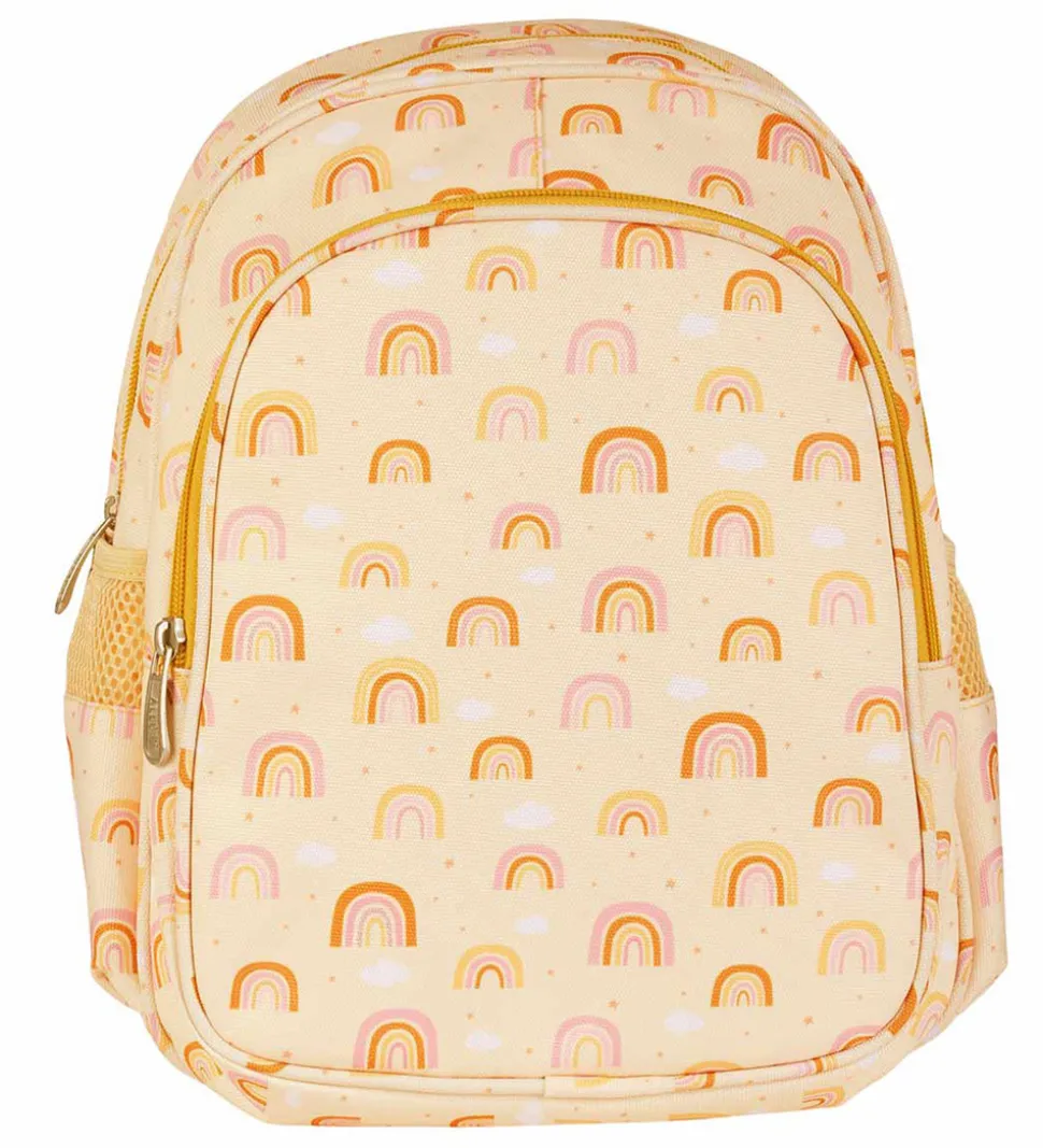 Smuk A Little Lovely Company børnehavetaske i creme med et allover print af regnbuer i karrygul og rosa samt hvide skyer. På siden er der en hvid applikation med mærkets navn.