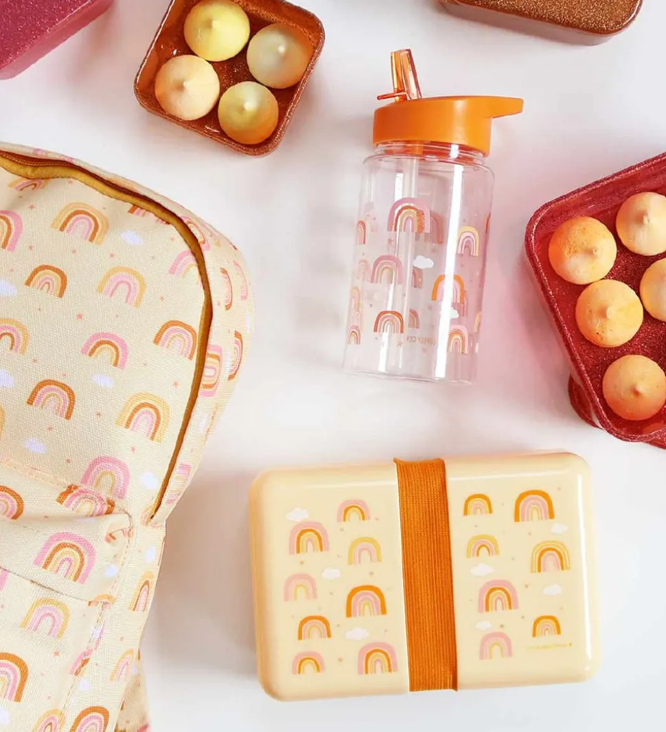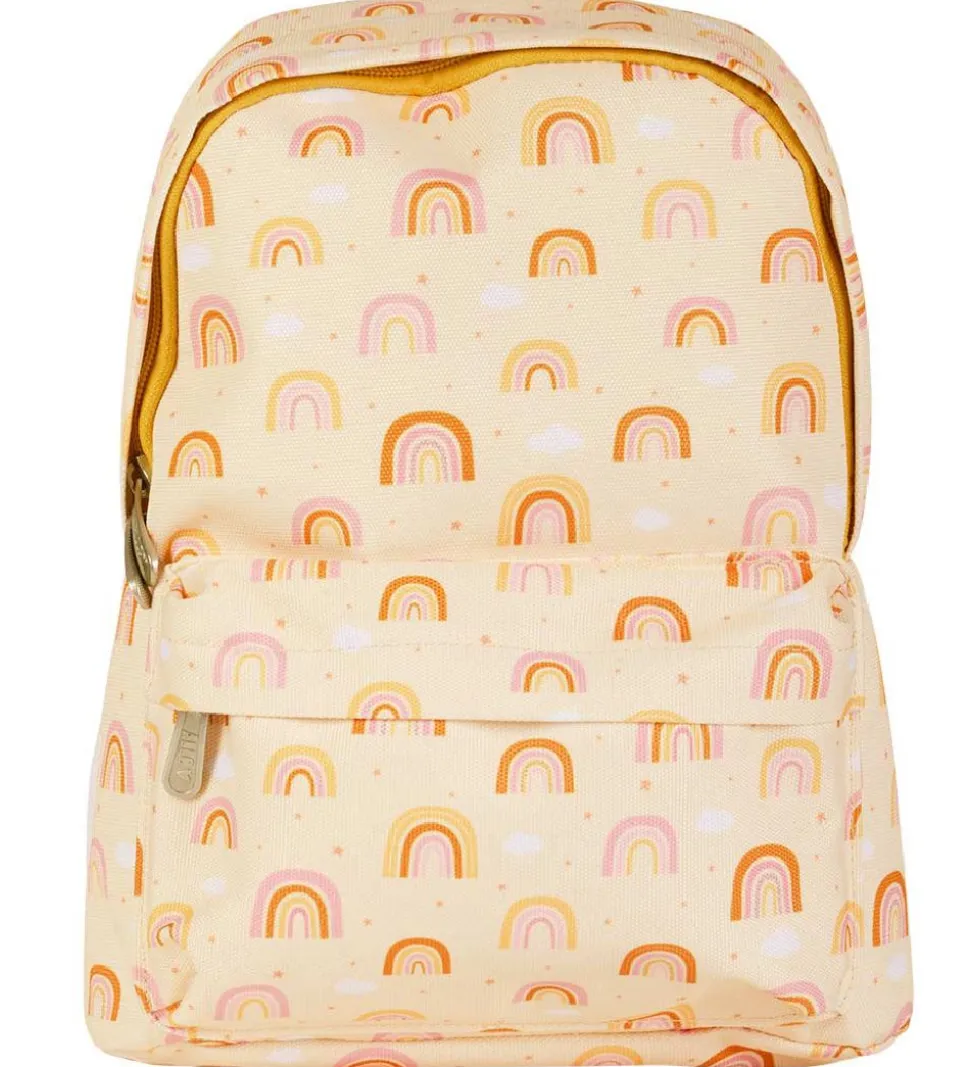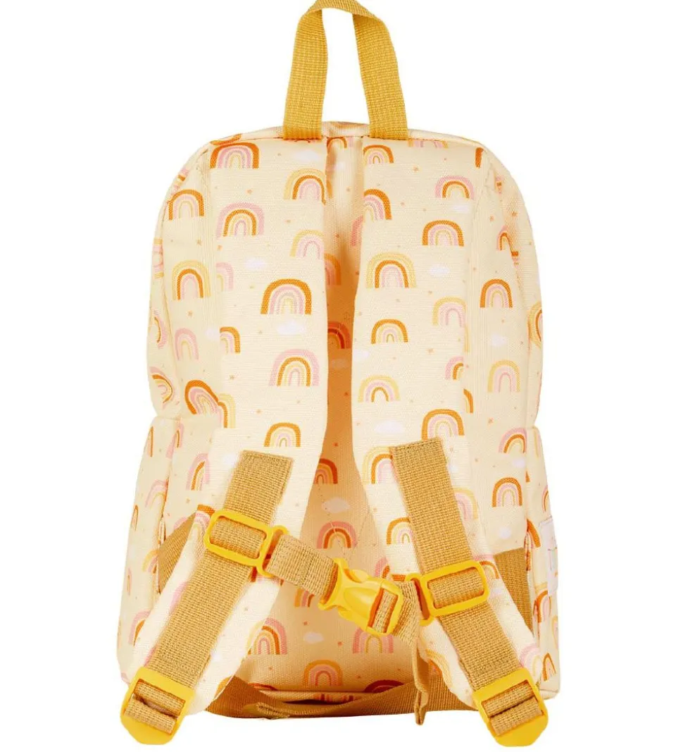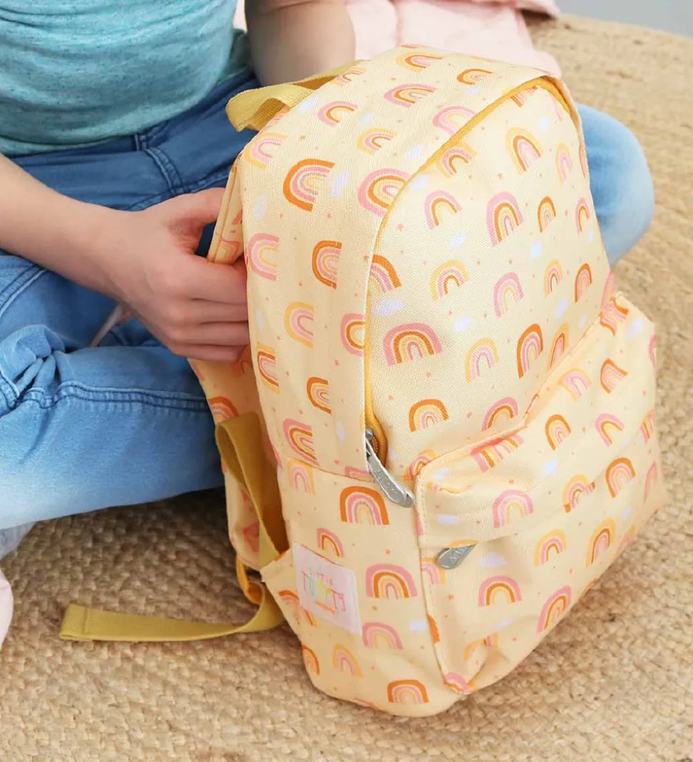 Yndig A Little Lovely Company børnehavetaske i creme med et allover print af regnbuer i karrygul og rosa samt hvide skyer. På siden er der en hvid applikation med mærkets navn.