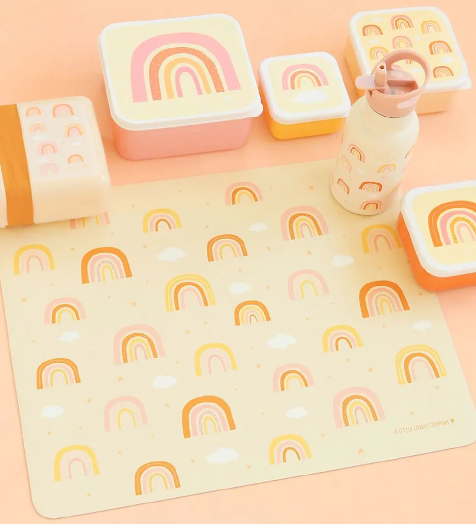 Sød A Little Lovely Company dækkeserviet i beige med et alloverprint af regnbuer, skyer og stjerner.