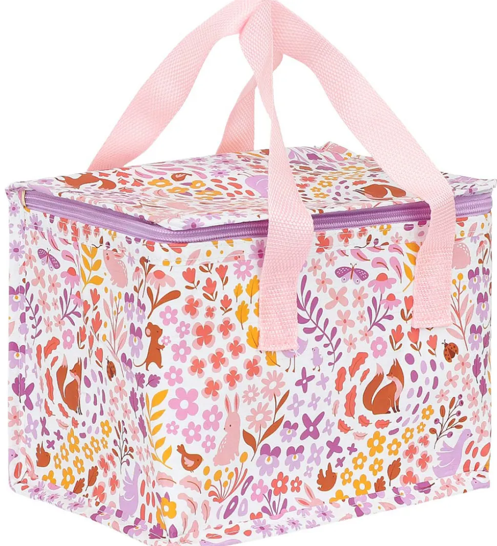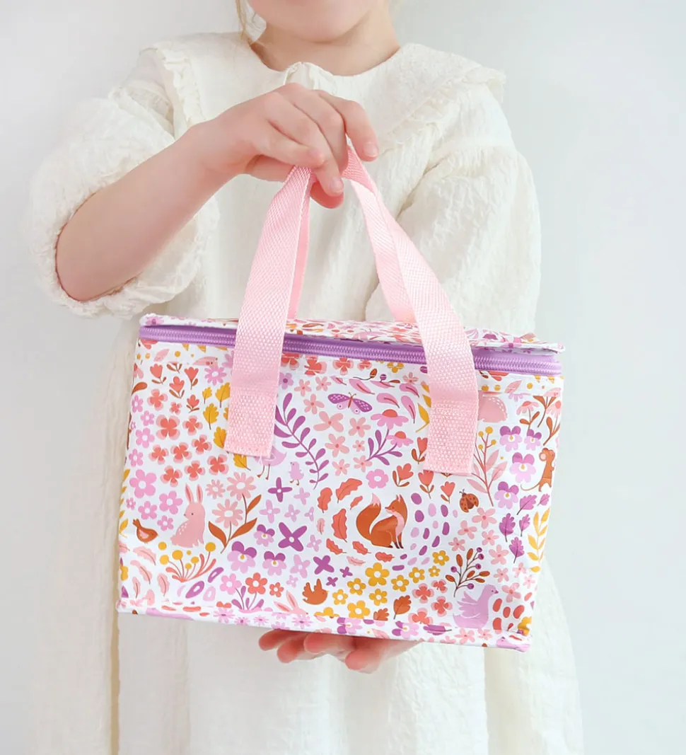 Fin A Little Lovely Company køletaske i hvid med print af søde dyr, blomster og blade i primært lilla, rosa, brune og gule nuancer. Køletasken har rosa håndtag og lilla lynlås.