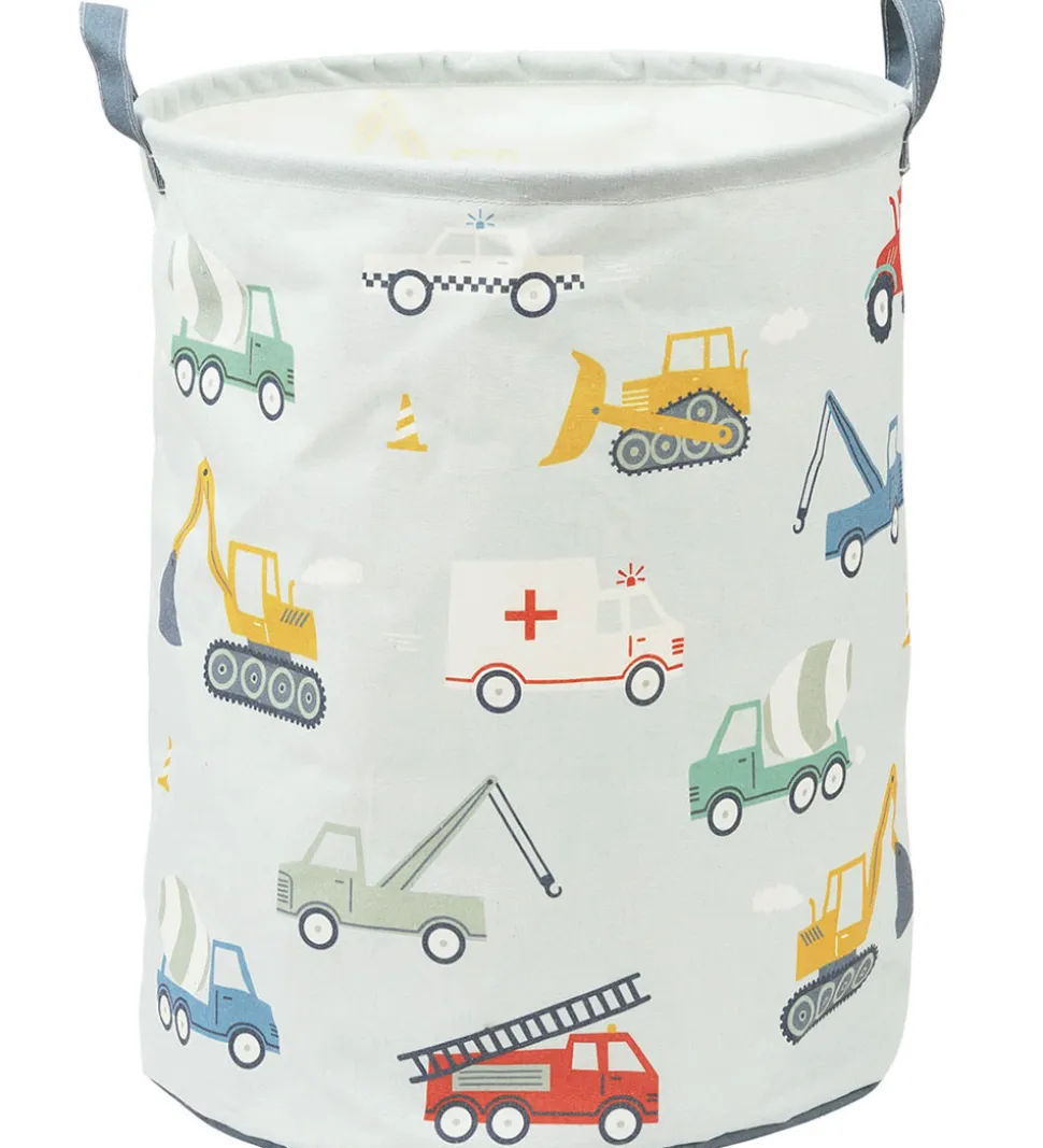 Pæn A Little Lovely Company opbevaringskurv i støvet blå med print af forskellige køretøjer.