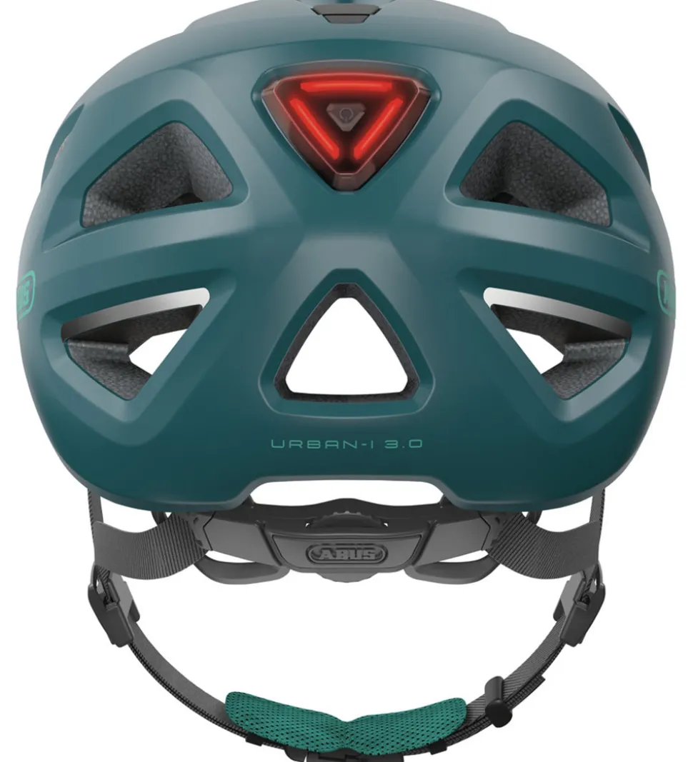 Smart Abus cykelhjelm i mat petroliumsblå med en lysere blå skygge fortil. Bagtil er der praktiske refleksdetaljer.