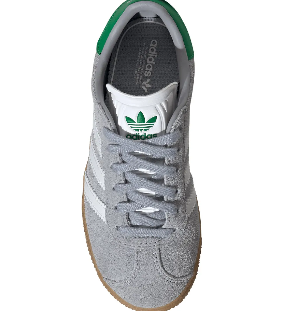 Smarte adidas Originals sko i gråt ruskind med tre hvide logostriber af imiteret skind på siderne. Bagpå er der et grønt mærke af imiteret skind med et gråt logo.