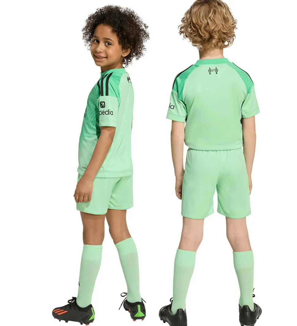 Flot adidas Performance fodboldsæt i neongrøn med sorte detaljer. Sættet er inspireret af holdets hjemmebane-målmandstøj i sæsonen 25/26.
