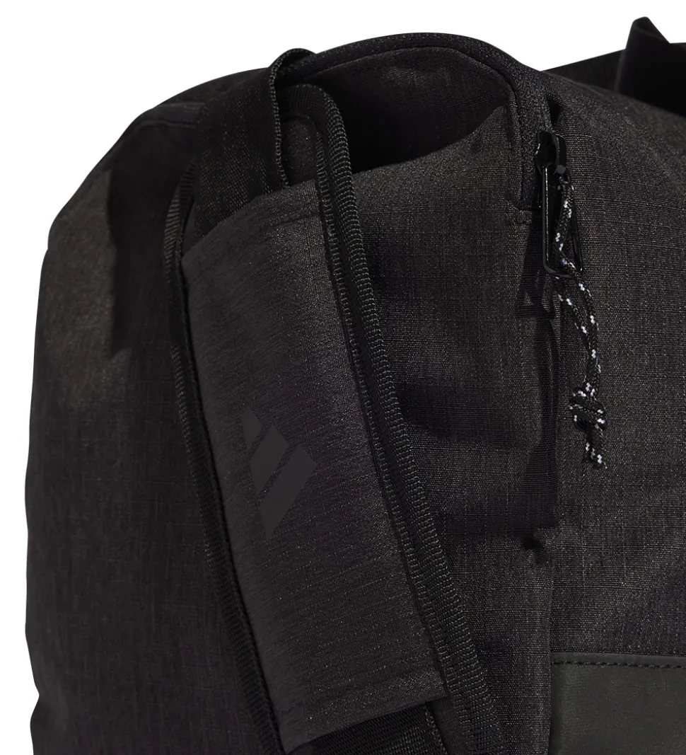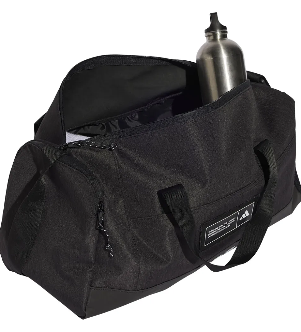 adidas sportstasken består af et stort rum, som åbnes på toppen. Indvendigt er der en lille åben lomme i den ene side, og en større åben lomme i den anden side. Udenvendigt er der en åben meshlomme i den ene ende af tasken, og i den anden ende er der en lomme med lynlåslukning.