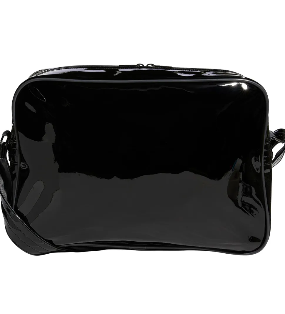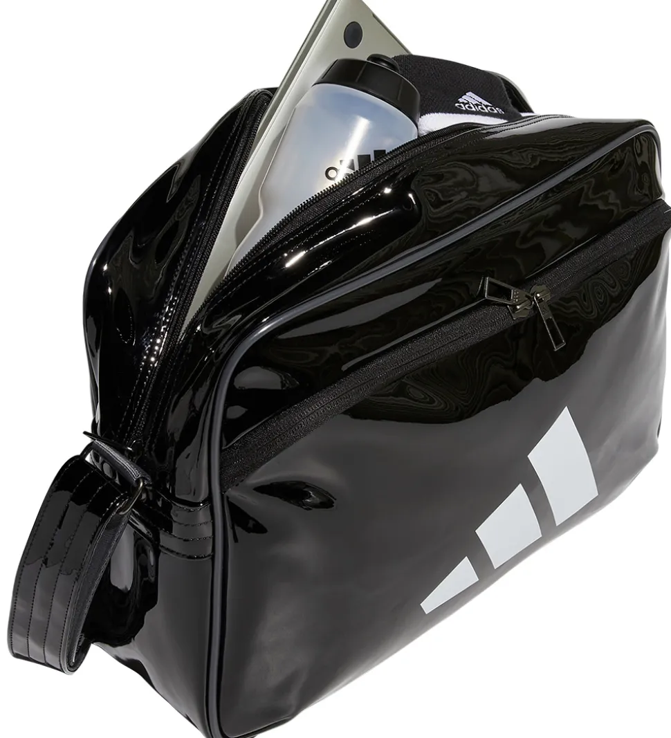 Flot adidas Performance sportstaske i skinnende sort PU med et stort, hvidt logoprint.