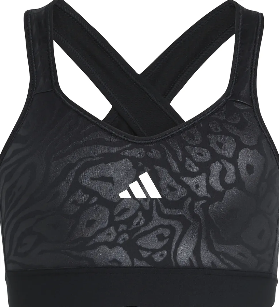 Sej adidas Performance træningstop i sort med et skinnende dyreprint. træningstoppen har brede skulderstropper, som krydser på ryggen, og i bunden er der en bred elastikkant. Træningstoppen er lavet i en blød og strækbar kvalitet, og på ryggen har den mesh.