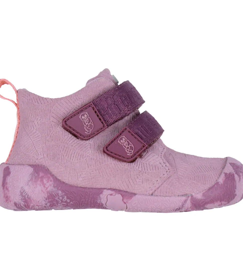 Fine Affenzahn begynderstøvler i lyselilla ruskind med mønster af blade præget ind i skindet. Begynderstøvlerne har mørkelilla velcroremme, en rosa strop bagpå og mønstrede ydersåler i lilla nuancer.