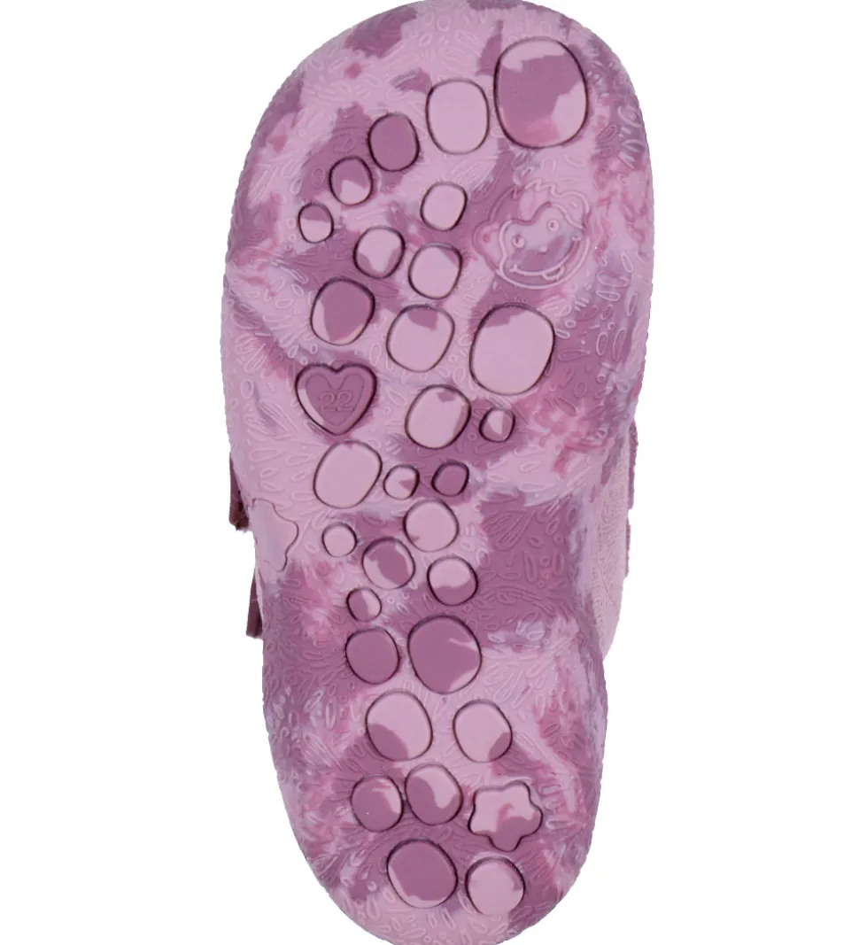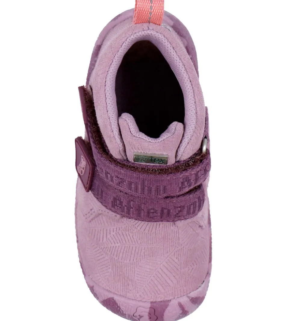 Affenzahn begynderstøvlerne har et kort skaft, som går lige over anklerne. De lukkes fortil med to velcroremme, og bagtil er der en praktisk strop. Indvendigt er der lilla tekstil. Begynderstøvlerne har bløde og letvægtige ydersåler, som går op over hælen og snuden. Under bunden er der et prikket mønster, som sikrer et godt fodfæste.