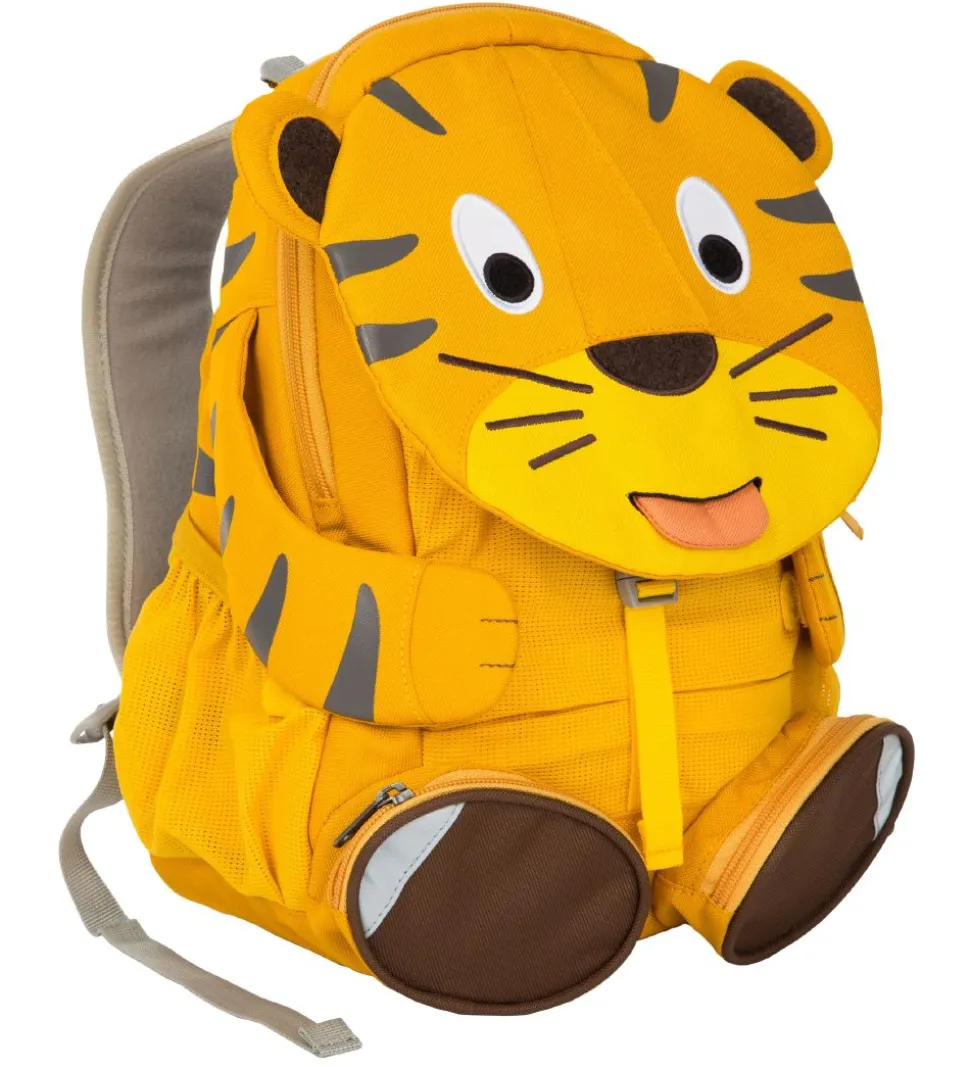 Fin Affenzahn rygsæk i gule nuancer med form som en tiger. Fortil er der to øjne i hvid og sort samt en rosa tunge. Tungen sidder fast med en elastik, så når man trækker i den kommer der et navneskilt frem. På tigerens brune fødder er der reflekser.