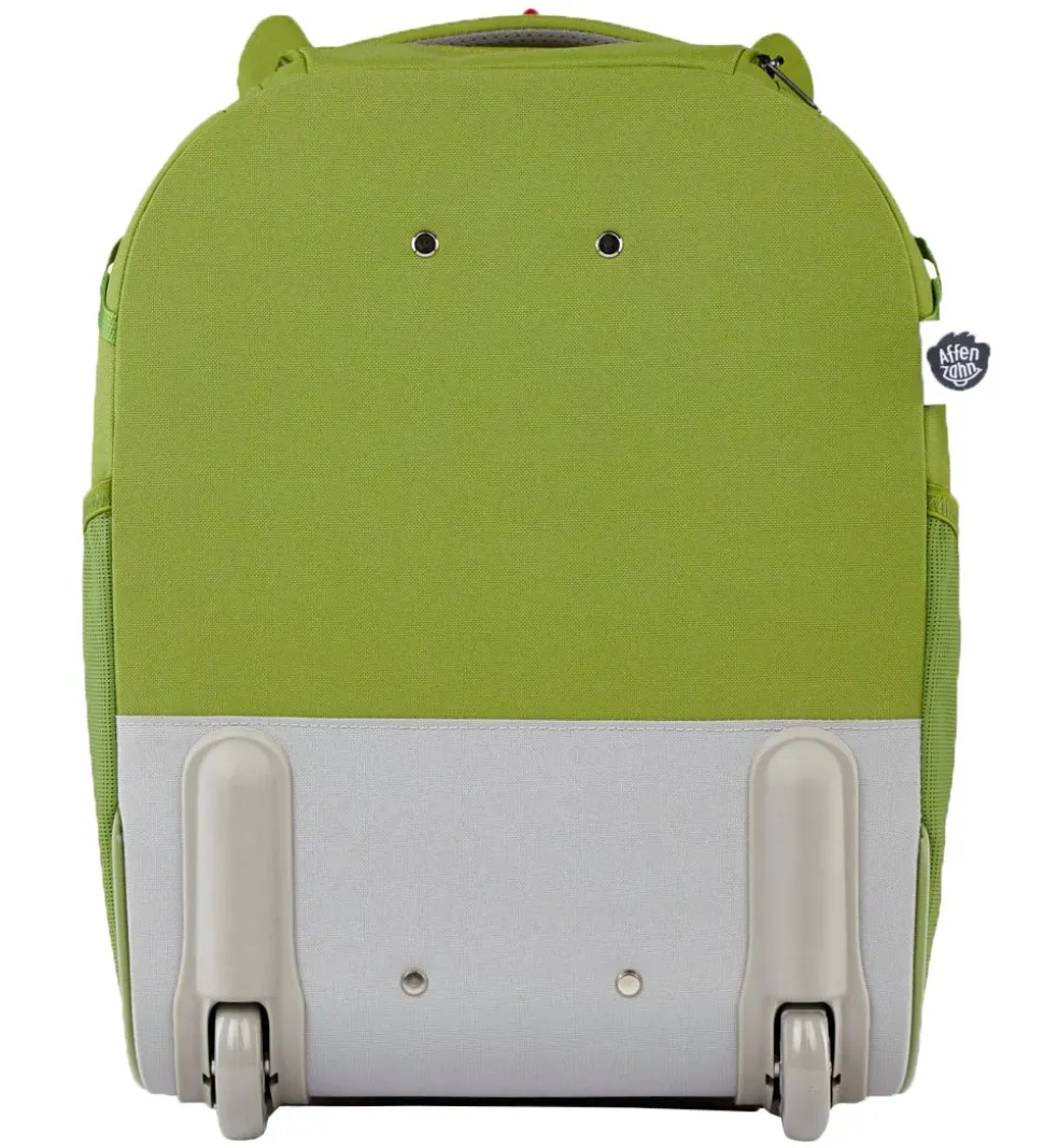 Sød Affenzahn trolley i grønne nuancer, med form som en drage. Fortil er der to savtakket pikke, to ører, øjne og en tunge. Tungen sidder fast med en elastik, og når man trækker i den, kommer der et navnemærke til syne.