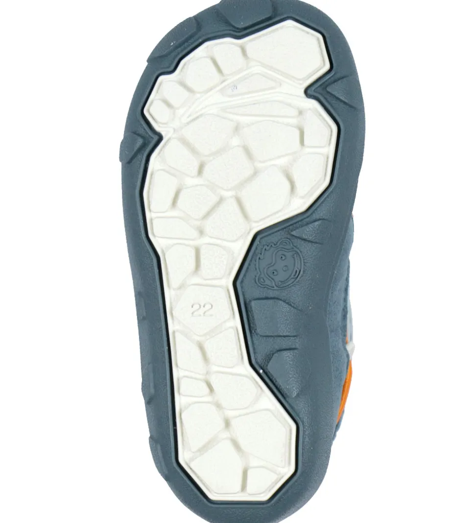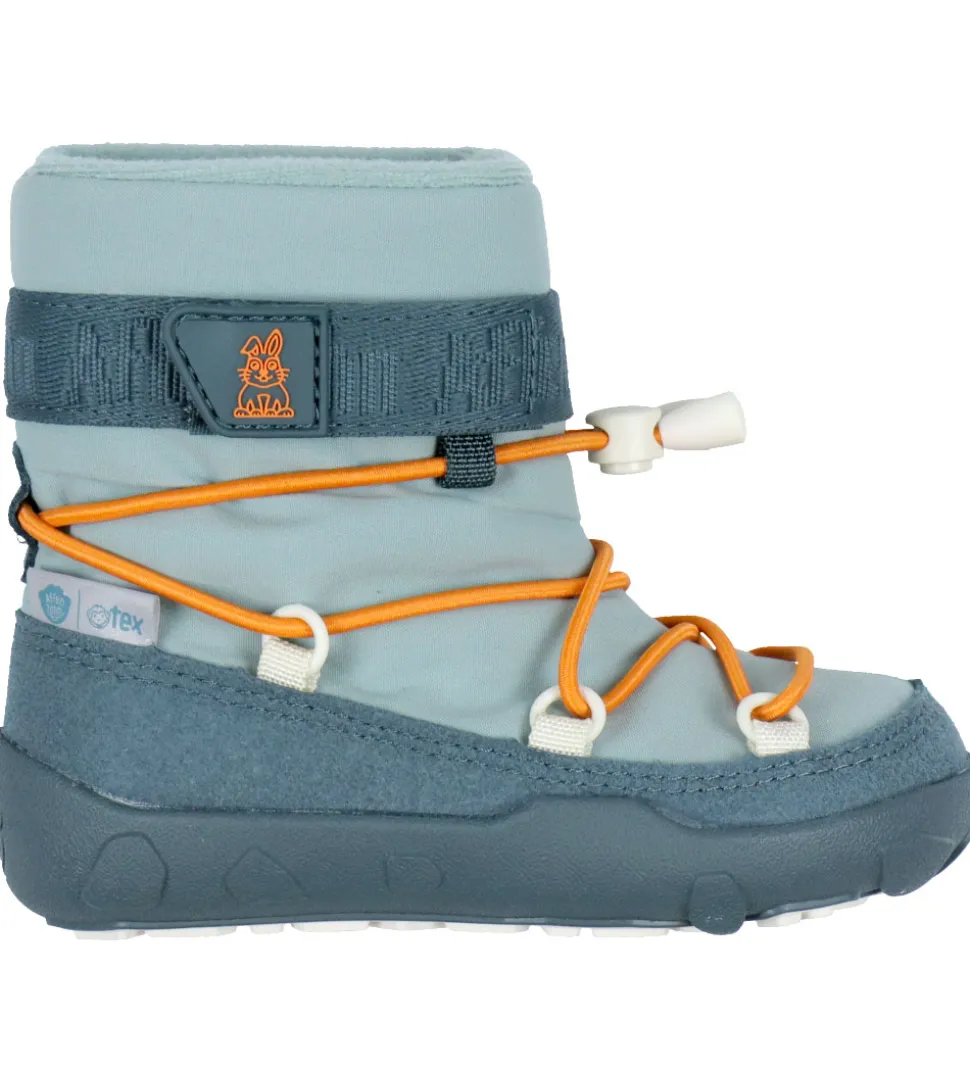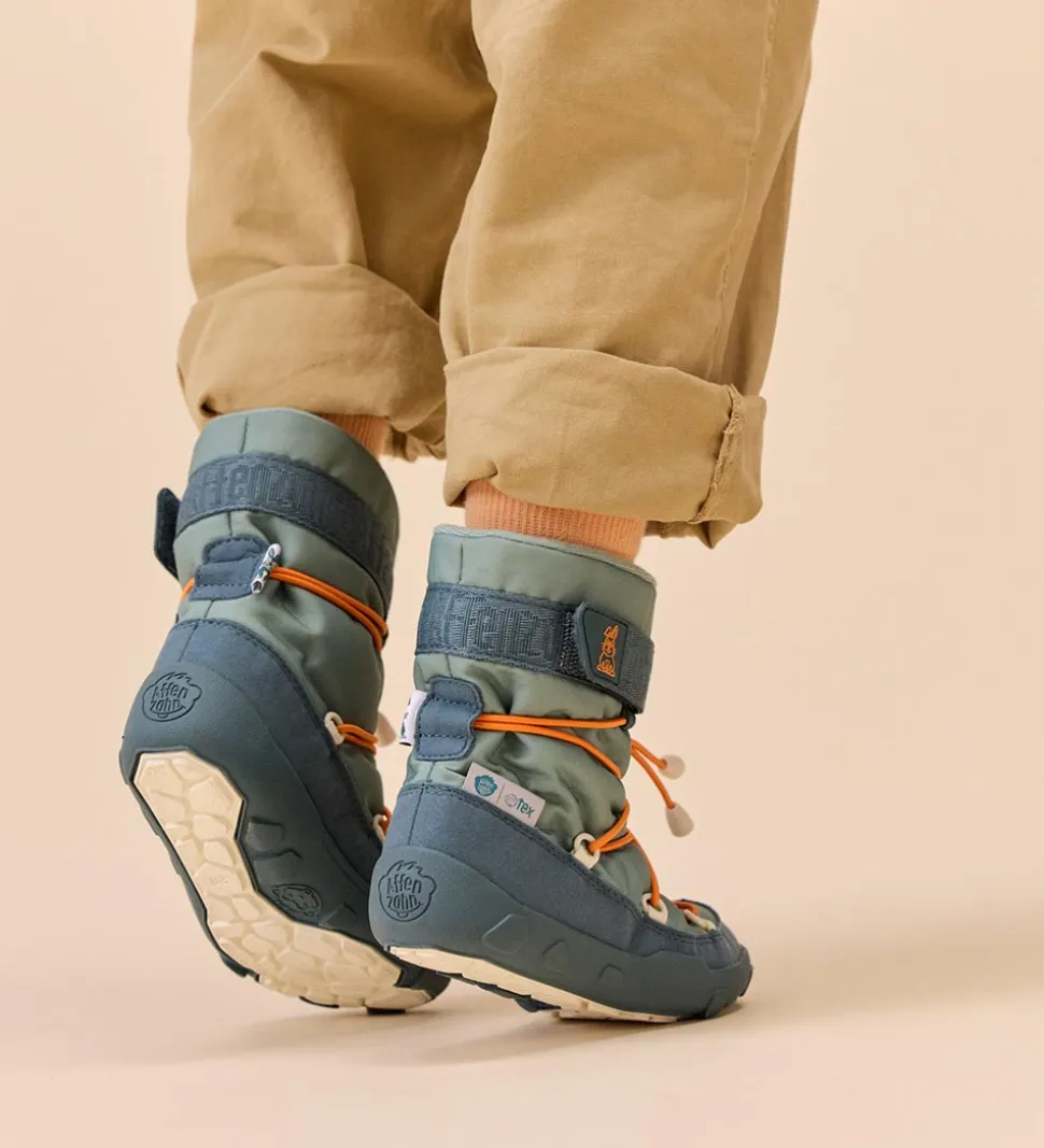 Flotte Affenzahn vinterstøvler i turkis tekstil og petroleumsblåt imiteret ruskind. Vinterstøvlerne har orange snører.