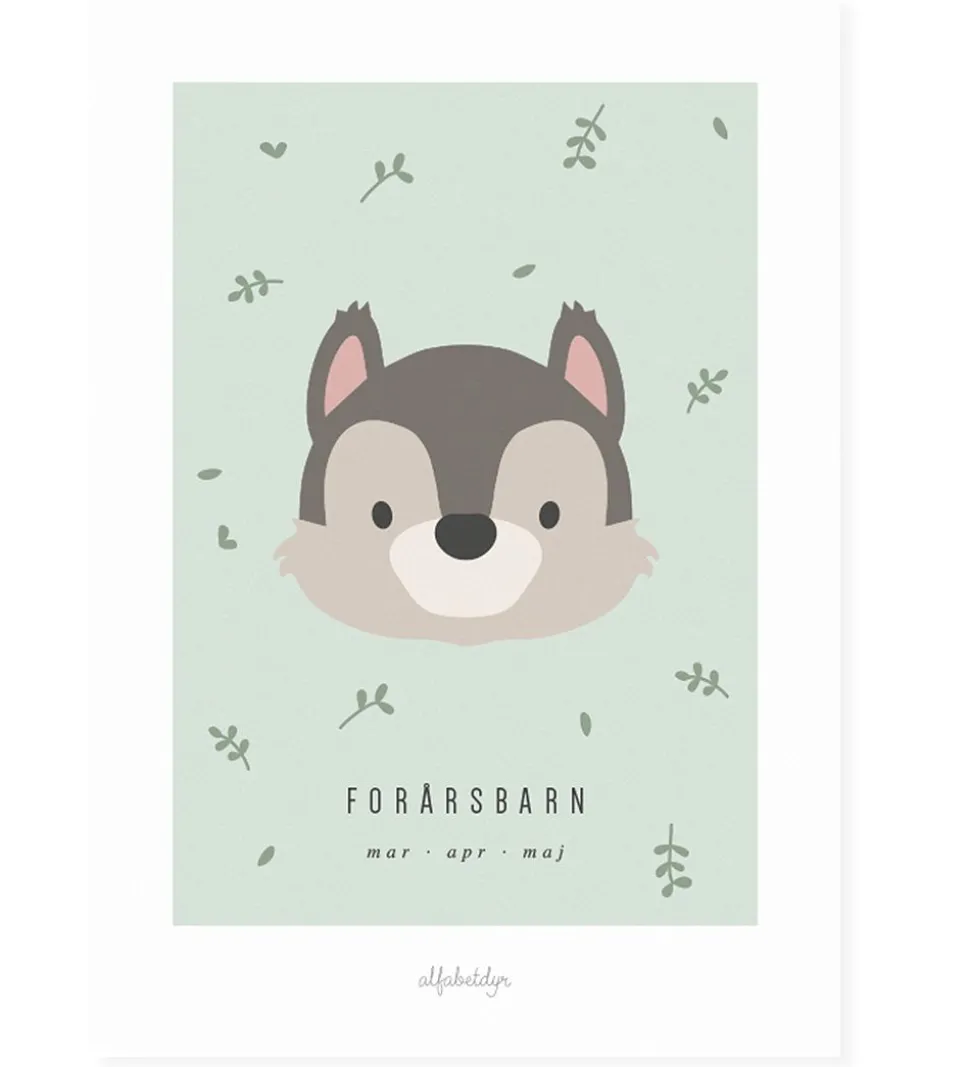 Skøn Alfabetdyr plakat i støvet grøn, med mørkegrønne blade og et sødt jordegern. Under jordegernet er teksten “Forårsbarn” samt “mar – apr – maj”.