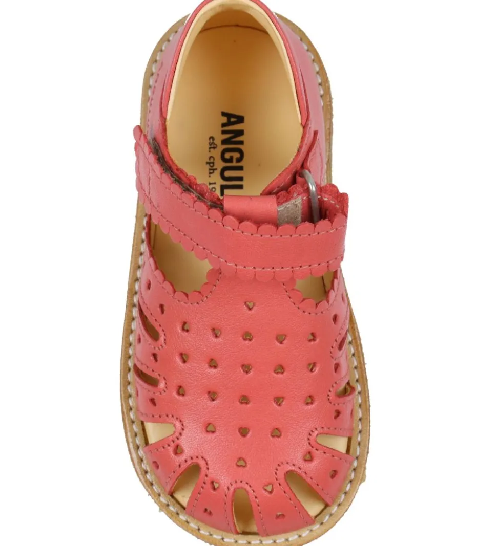 Søde Angulus begyndersandaler i koralfarvet læder med fint hulmønster ved tæerne.