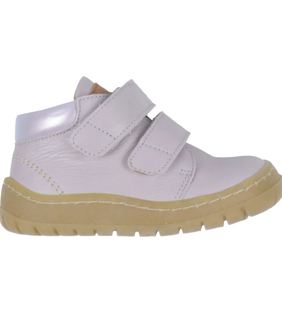 Angulus begynderskoen har to justerbarer velcrolukninger over vristen, og har et skaft som går til lidt over anklen. Dette – kombineret med den faste hælkappe – sikrer barnet en god, støttende og behagelig pasform. Under bunden af begynderskoene er faste gummisåle med et skridsikkert mønster.