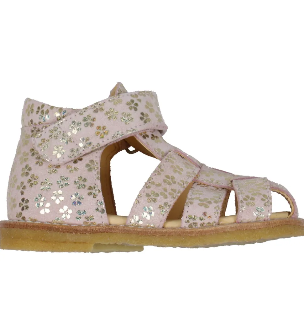 Smarte Angulus sandaler i rosa skind med et alloverblomsterprint i skinnende guld og med flettede remme på toppen.