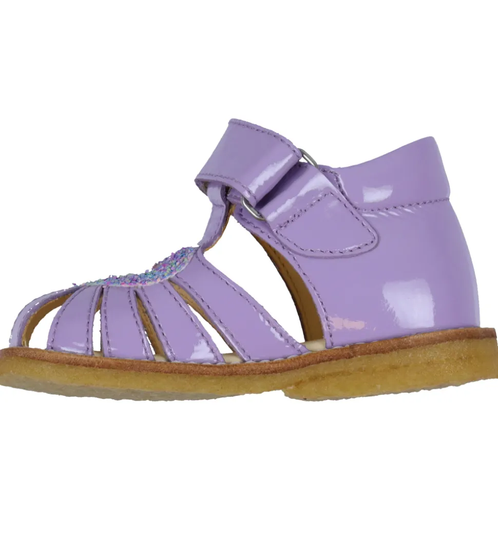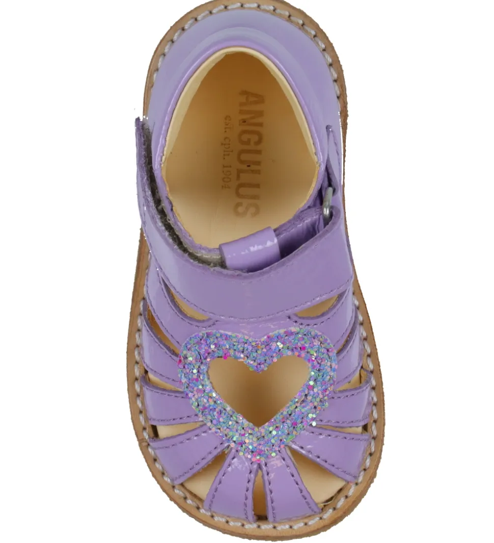 Søde Angulus sandaler i skinnende lilla skind, med et hjerte formet hul over foden, med flotte pailletter i forskellige farver rundt om kanten.