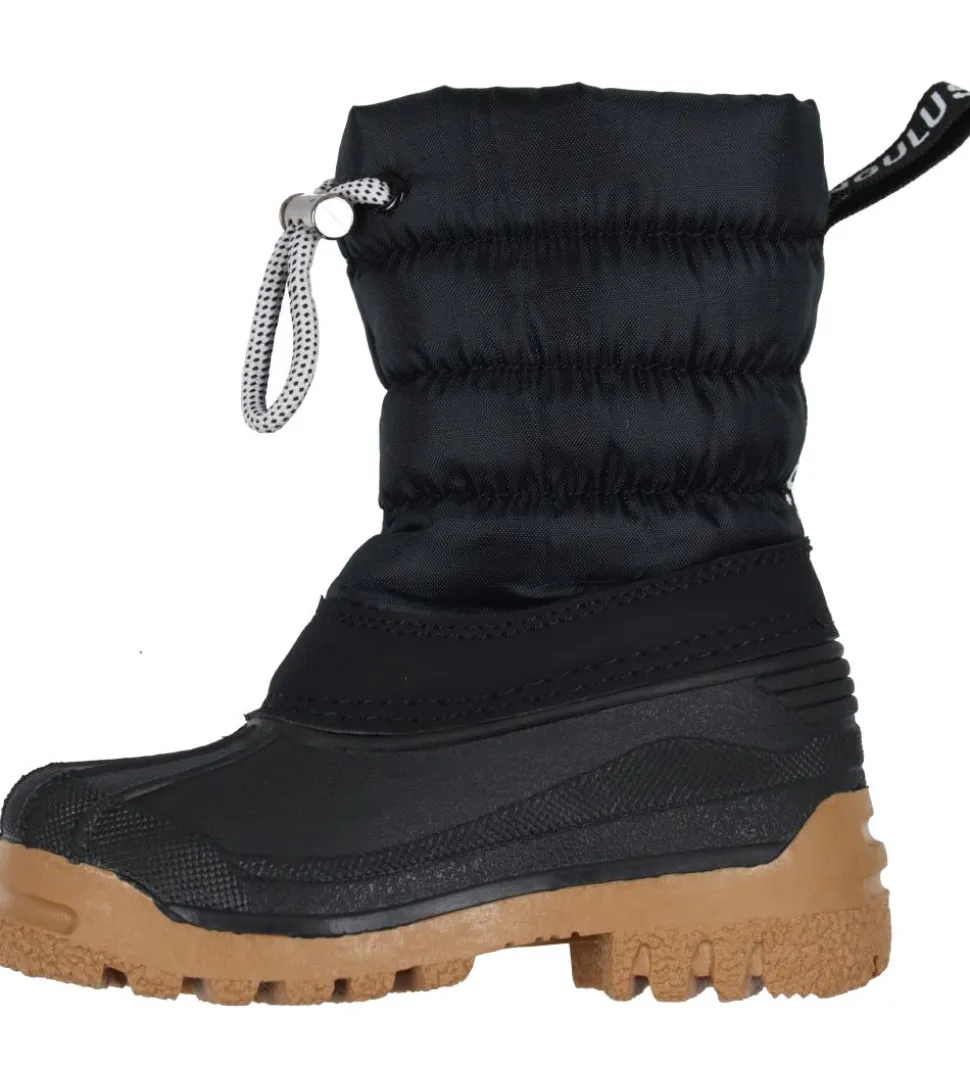 Lækre Anguglus termostøvler i sort med vandrette syninger, og på hælen er mærkets logo skrevet i hvid.