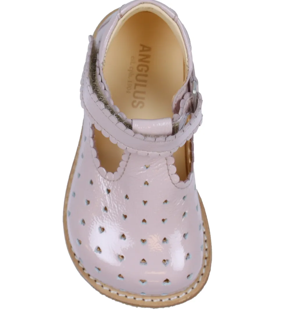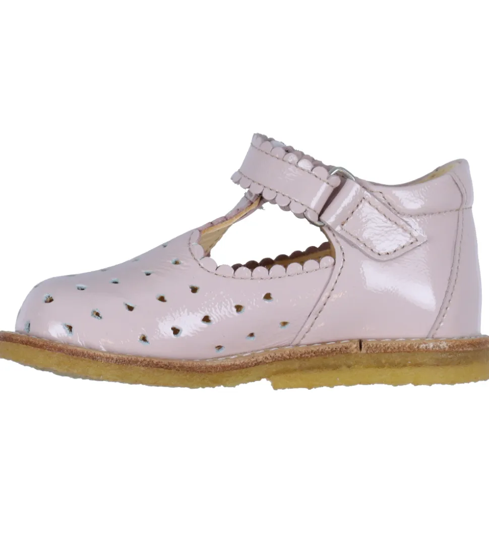 Søde Angulus tullesko i rosa lak med et hulmønster lavet af små hjerter.