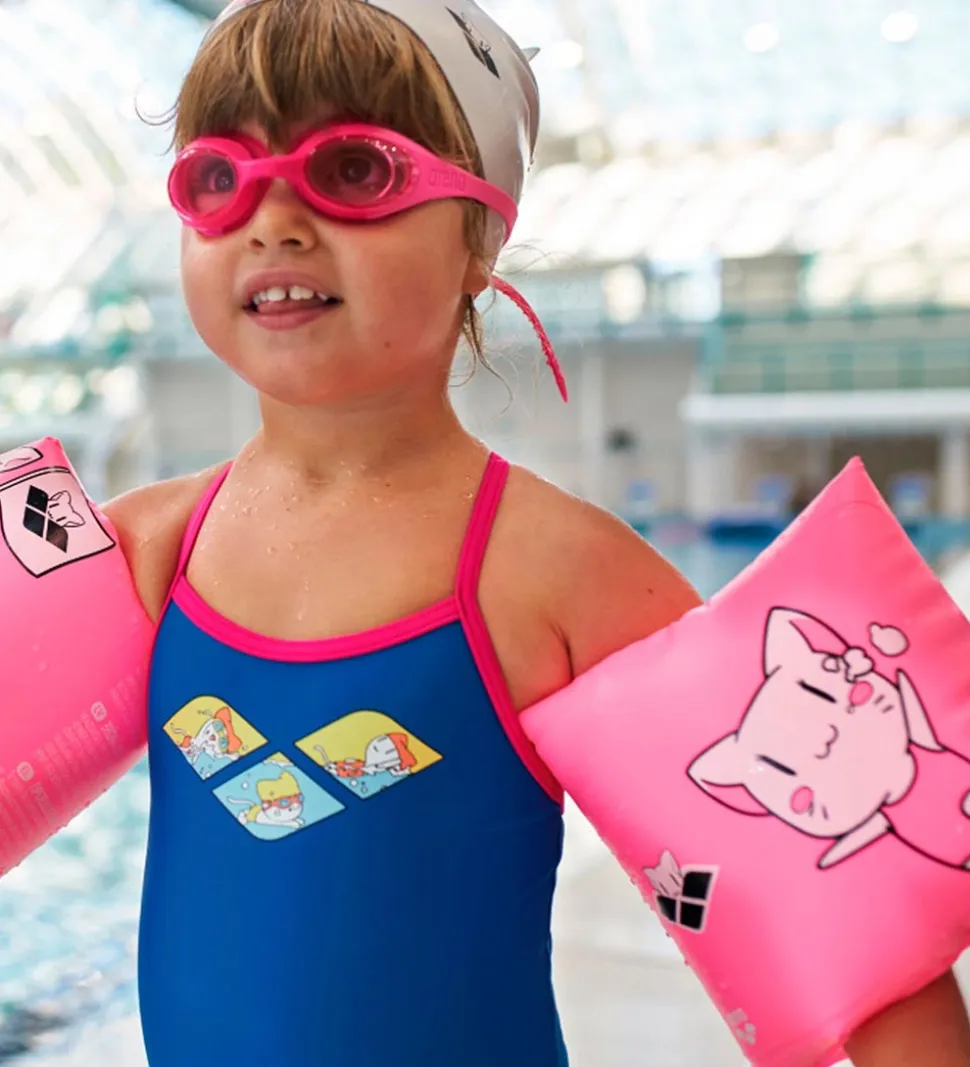 Fine Arena badevinger i fuchsia med en pink kant. På forsiden er der fint, hvidt print af katte på stranden.
