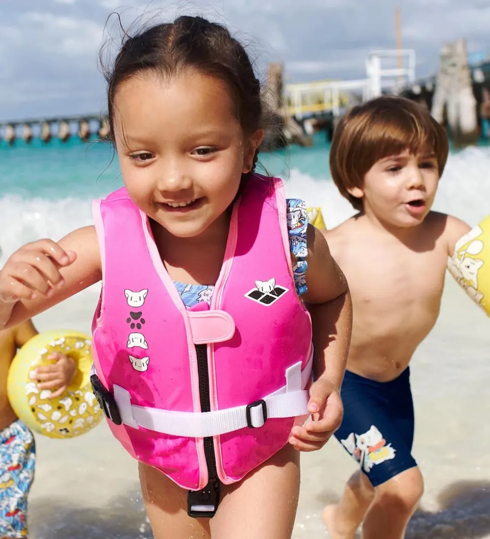 Sød Arena Friends svømmevest i rosa med print af Arene Friends kattene samt logoet i sort og hvid. I kanten er vesten lysserød.