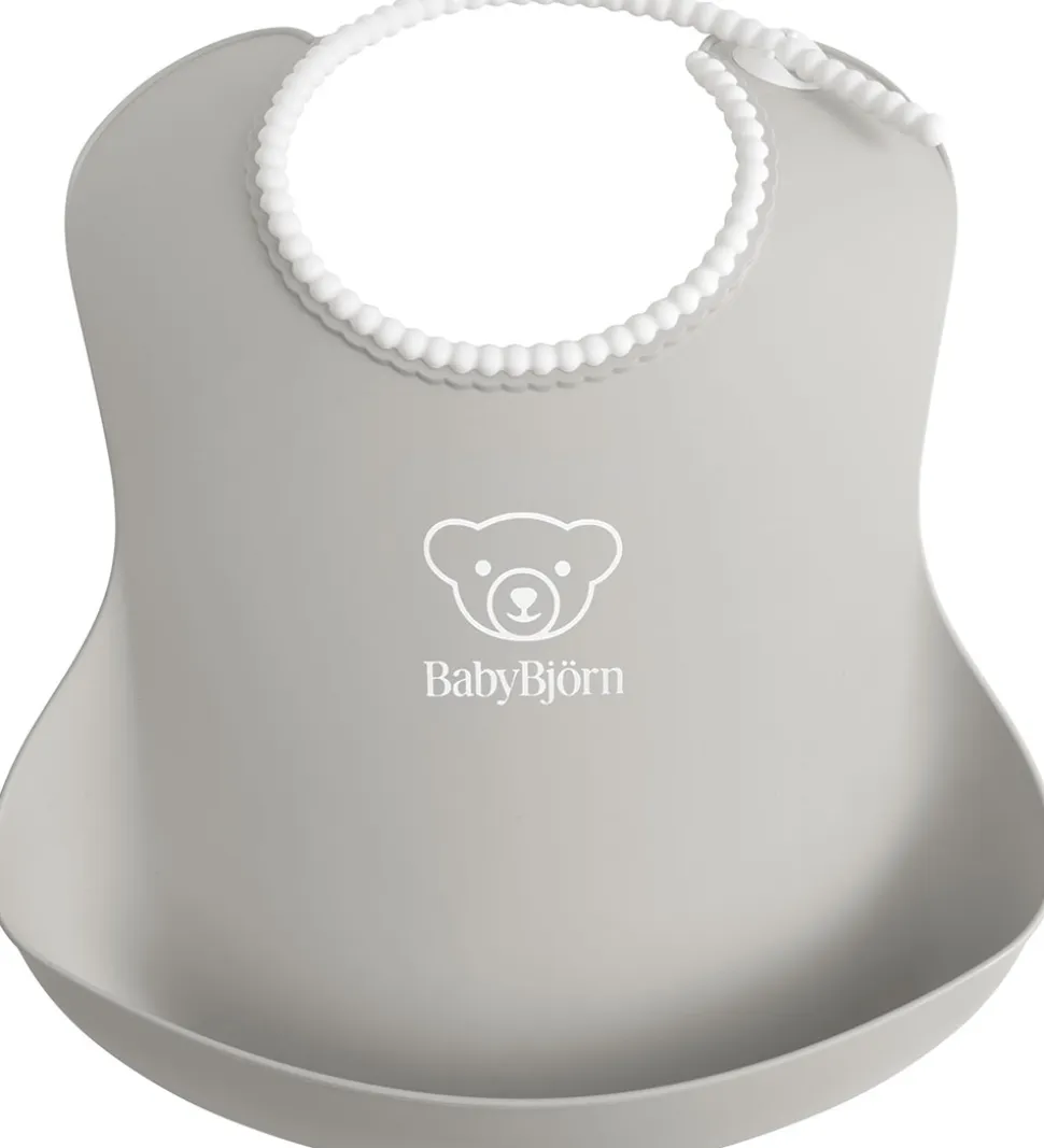 Flot BabyBjörn hagesmæk i grå med logoprint på fronten.