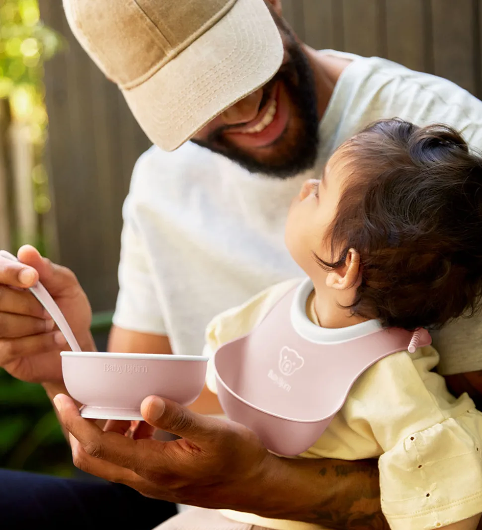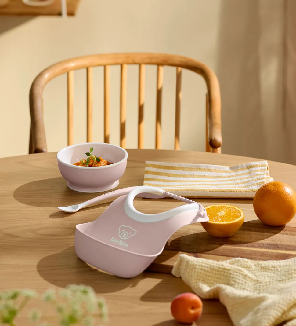 Fint BabyBjörn spisesæt i rosa og hvid bestående af følgende dele: