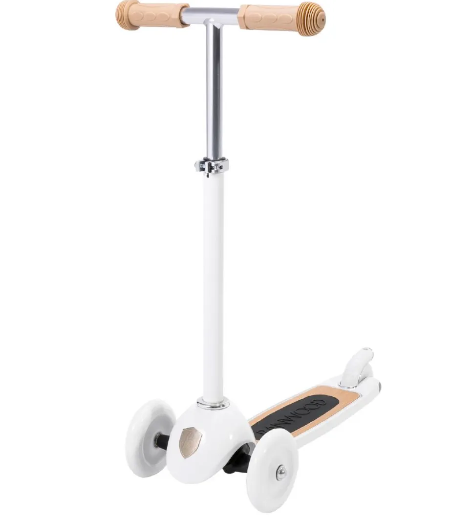 Banwood løbehjulet har to store hjul foran og et lille hjul bagpå med en fodbremse. Løbehjulet har en bred plade af eg med en sort gummistribe til at stå på, så barnet står stabilt. Styret kan justeres i tre højder, og det har håndtag af gummi, som giver et godt greb.
