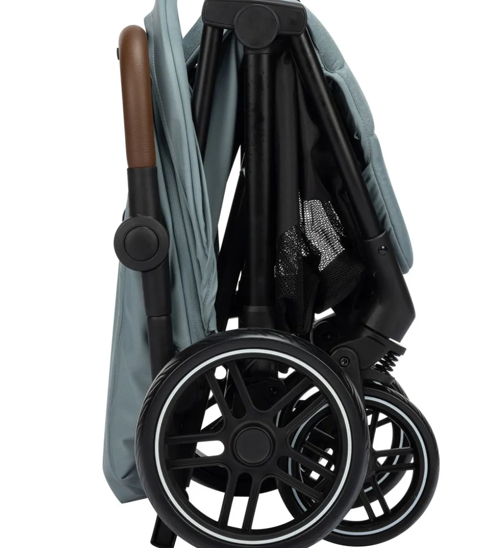 Klapvognen har 4 støddæmpende, punkterfri hjul, hvor de forreste kan drejes, og de kan låses, så de kun kører ligeud. De bageste hjul kan bremses samtidigt med én fod.