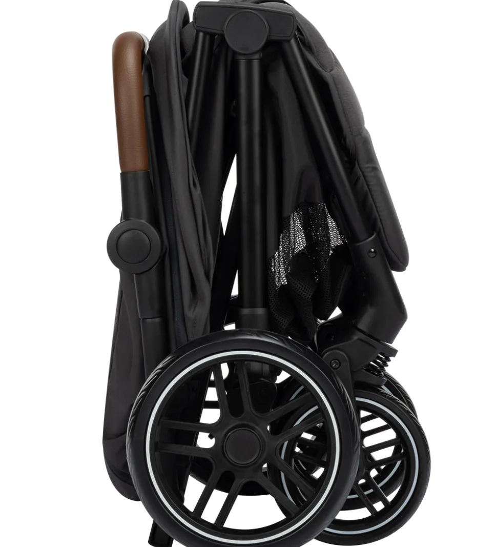 Klapvognen har 4 støddæmpende, punkterfri hjul, hvor de forreste kan drejes, og de kan låses, så de kun kører ligeud. De bageste hjul kan bremses samtidigt med én fod.
