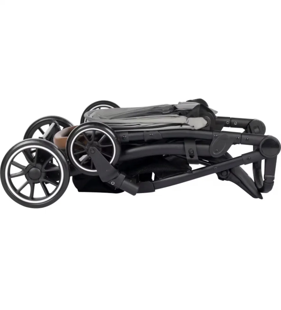 Klapvognen har 4 støddæmpende hjul, hvor de forreste kan drejes, og de kan låses, så de kun kører ligeud. De bageste hjul kan bremses samtidigt med én fod.
