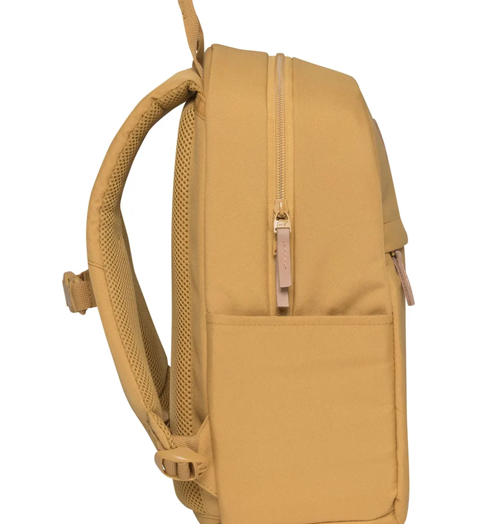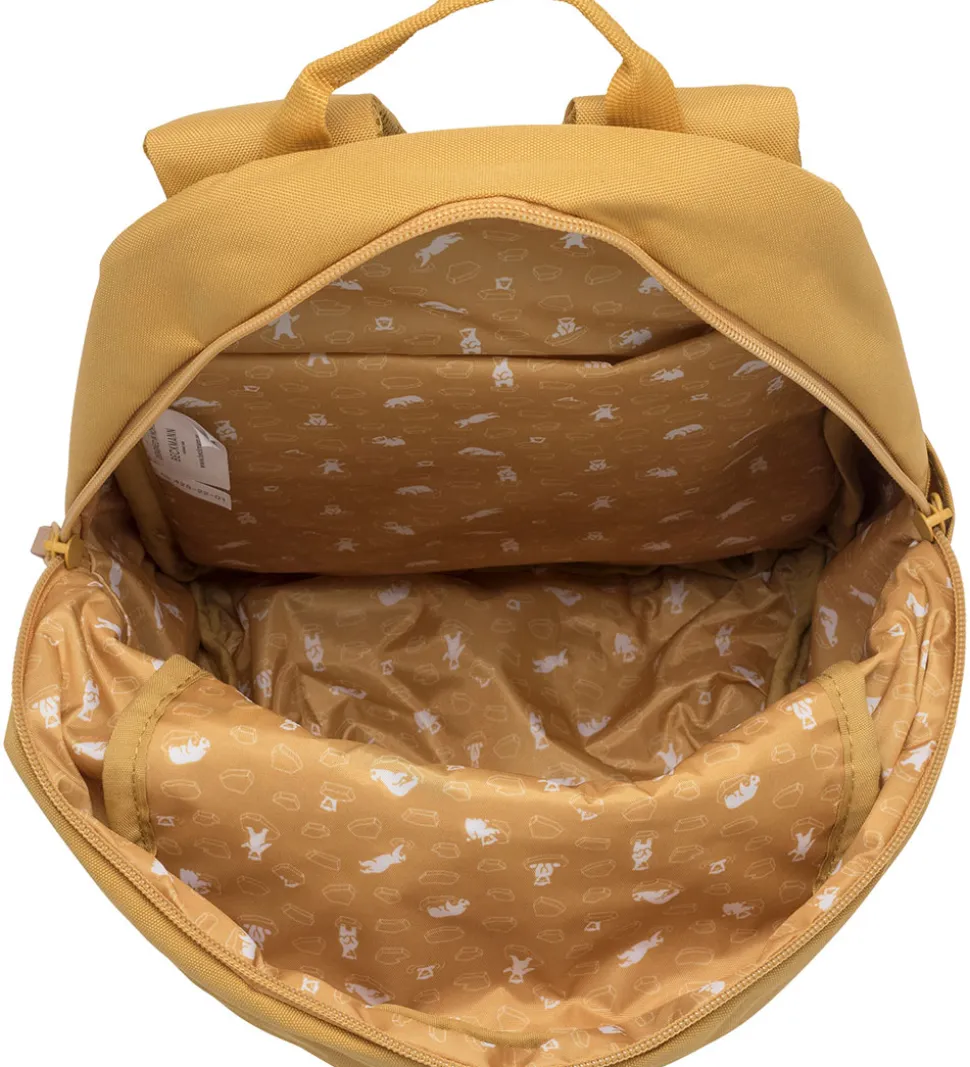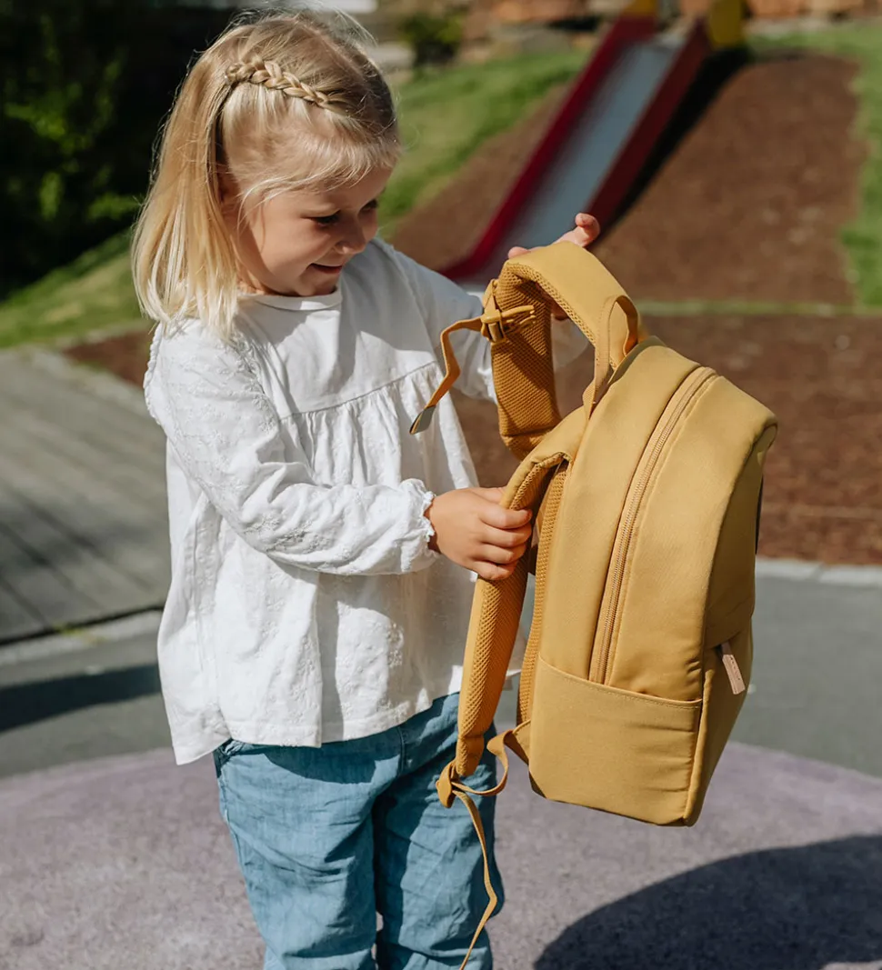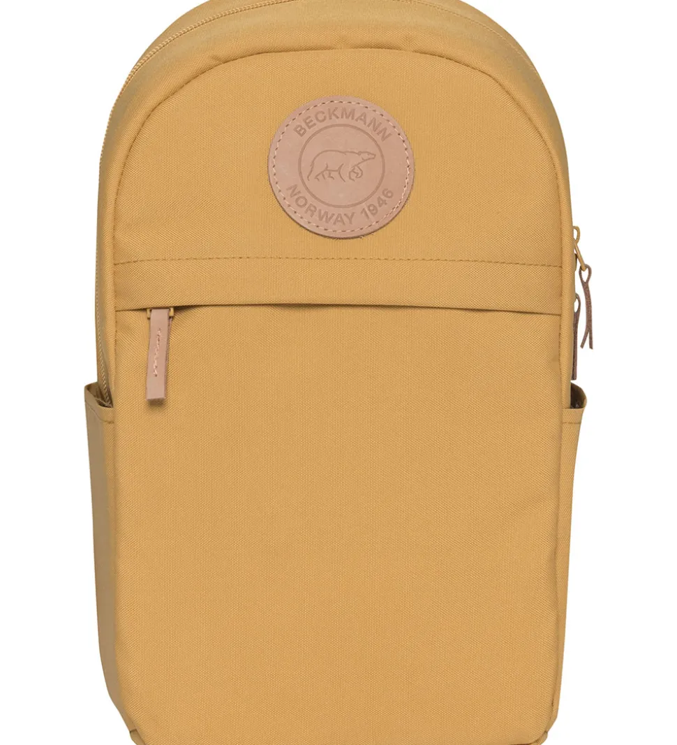 Flot Beckmann børnehavetaske i ensfarvet gul med et stort, rundt logo i lysebrunt skind og med skinddetaljer.
