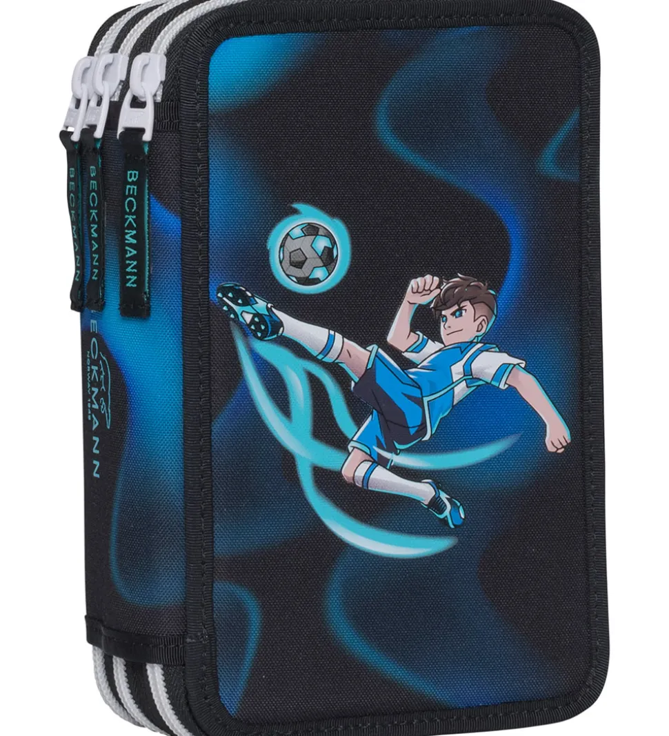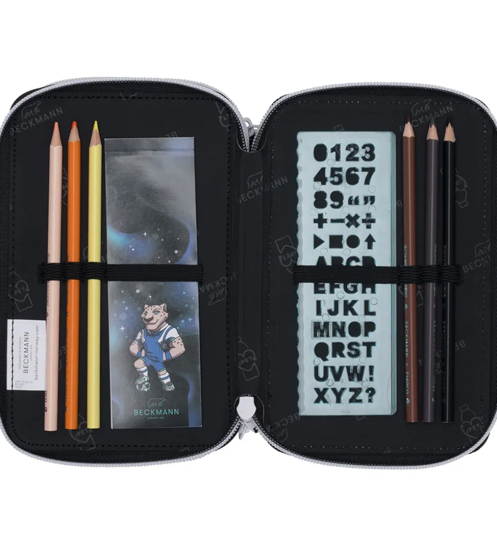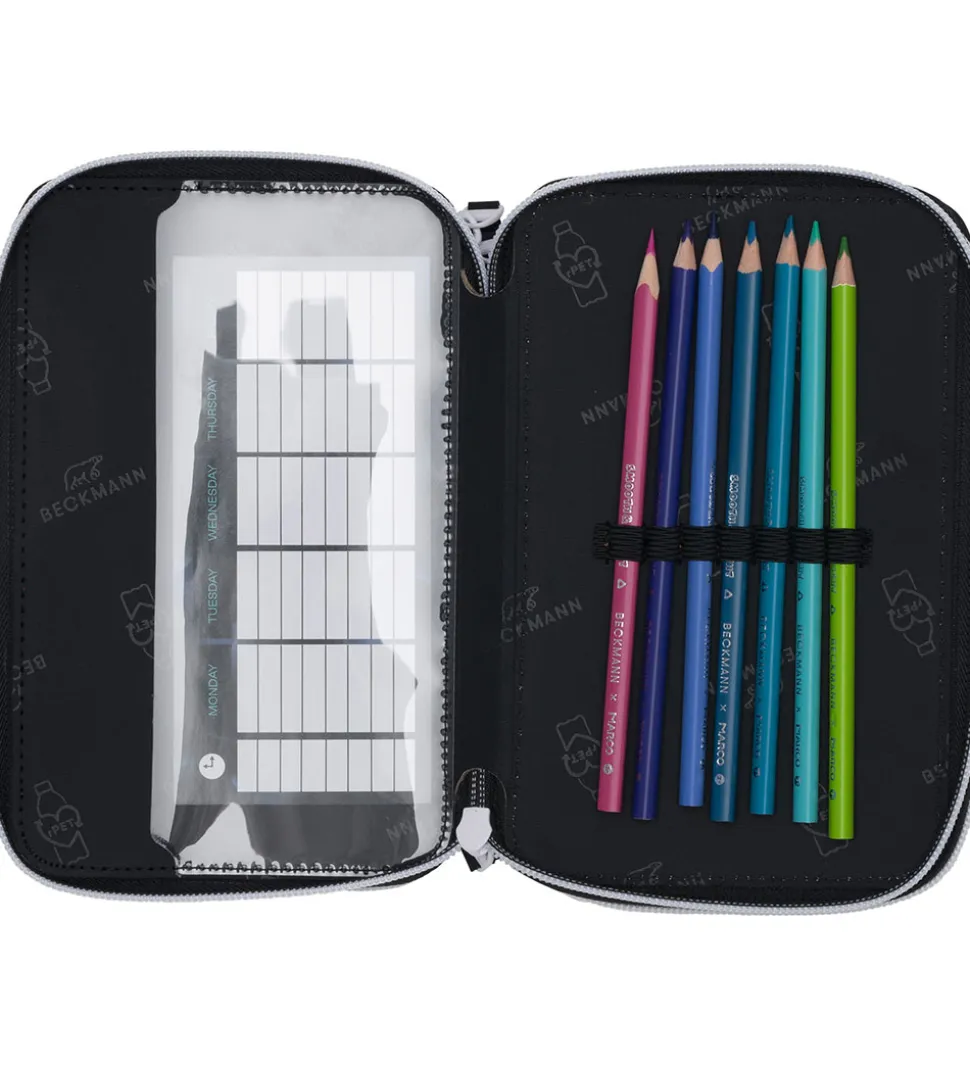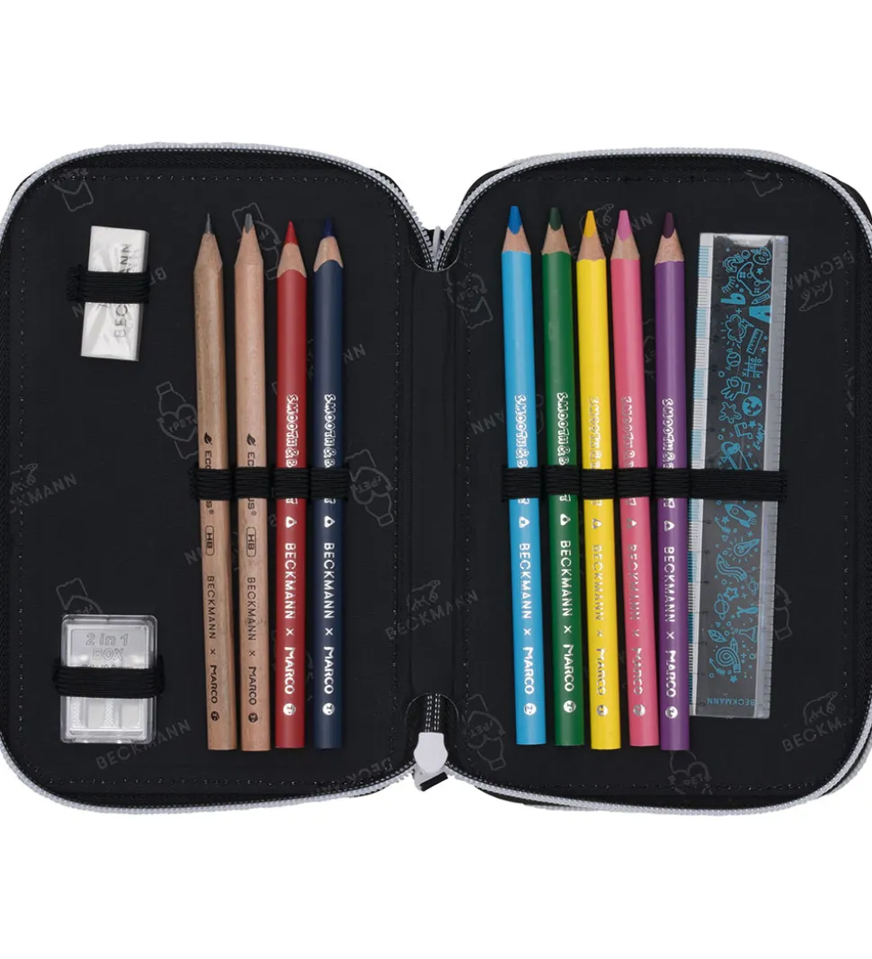 Beckmann penalhuset består af tre rum, som hvert åbnes med en lynlås, og det indeholder masser af tilbehør i god kvalitet fra Marco.