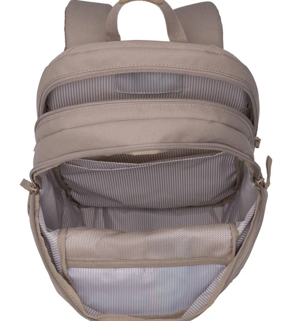 Flot Beckmann skoletaske i beige. På fronten er der en rund patch i beige imiteret skind med mærkets navn og logo.