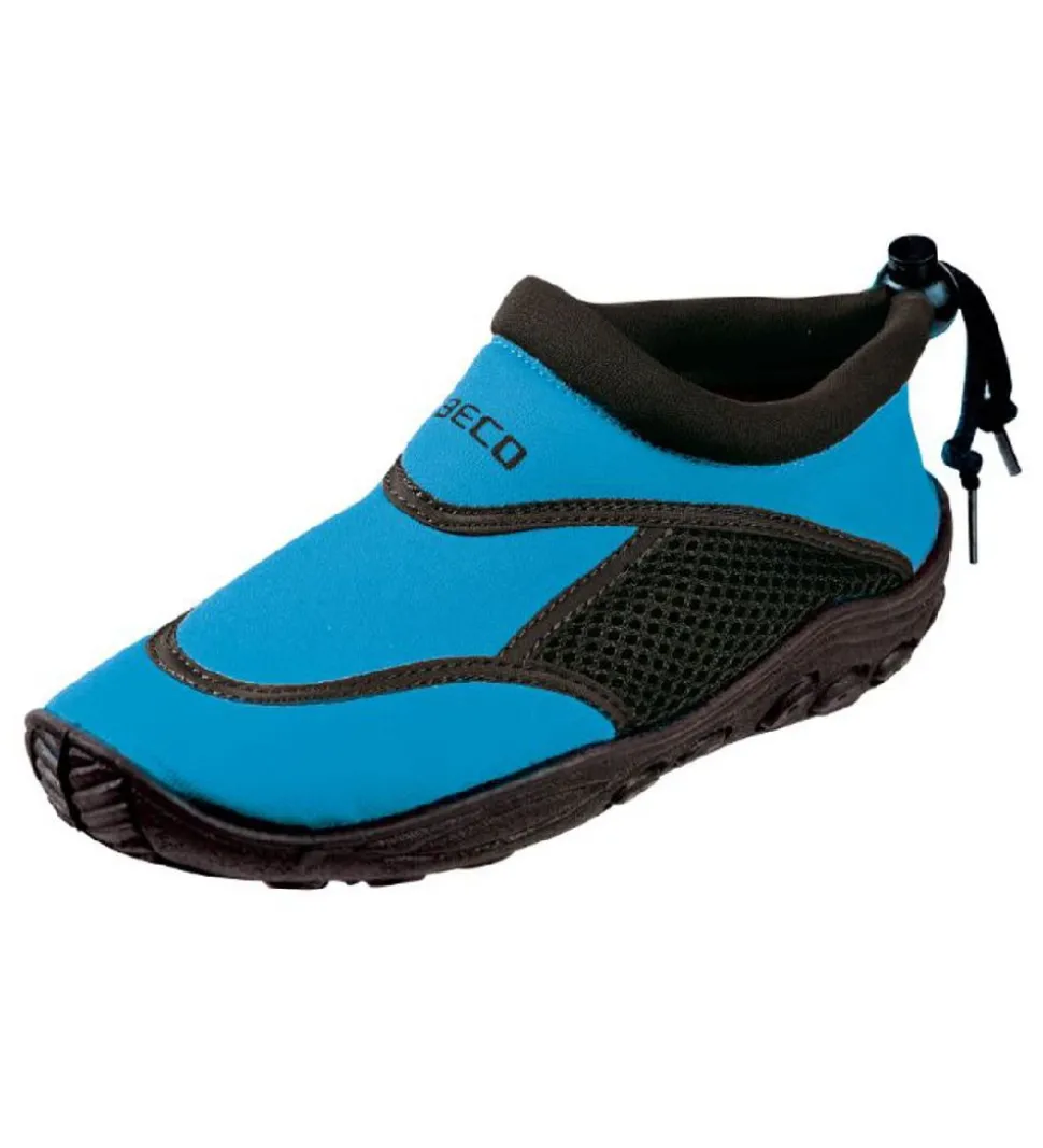 BECO badeskoene har en yderside af neopren. Indvendigt er der en sål, som let kan tages ud af skoene. BECO badeskoene har en ydersål af fleksibelt gummi med mønster, som går op mod snuden og hælen og sikrer god fodfæste og beskyttelse. Bagpå kan skoene spændes ind med en elastisksnøre og spænde.