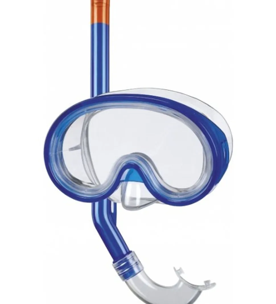 Fin BECO snorkelsættet indeholder en svømmemaske og en snorkel. Svømmemaske i transparent med en blå kant om glasset, og snorklen er også i blå med transparante dele.