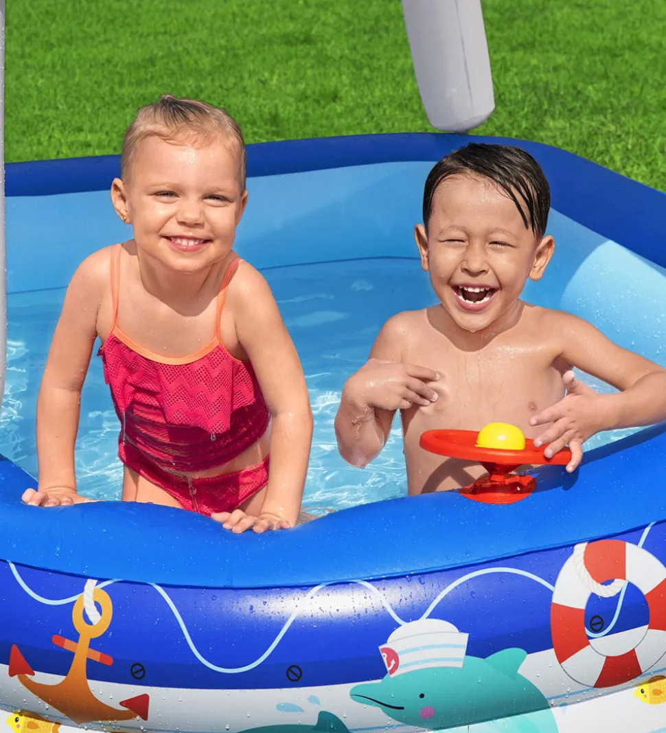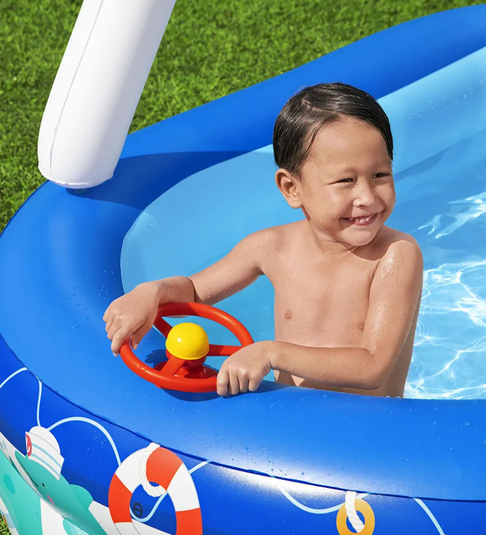 Bestway badebassinet er perfekt, når det er varmt udenfor, og der er brug for at blive kølet ned. Badebassinet er oppusteligt med to ringe som sidevægge, og det har en udformning som en båd. Badebassinet er udstyret med et aftageligt solskærms-tag og har et rat forrest på badebassint, som kan indgå i legen.
