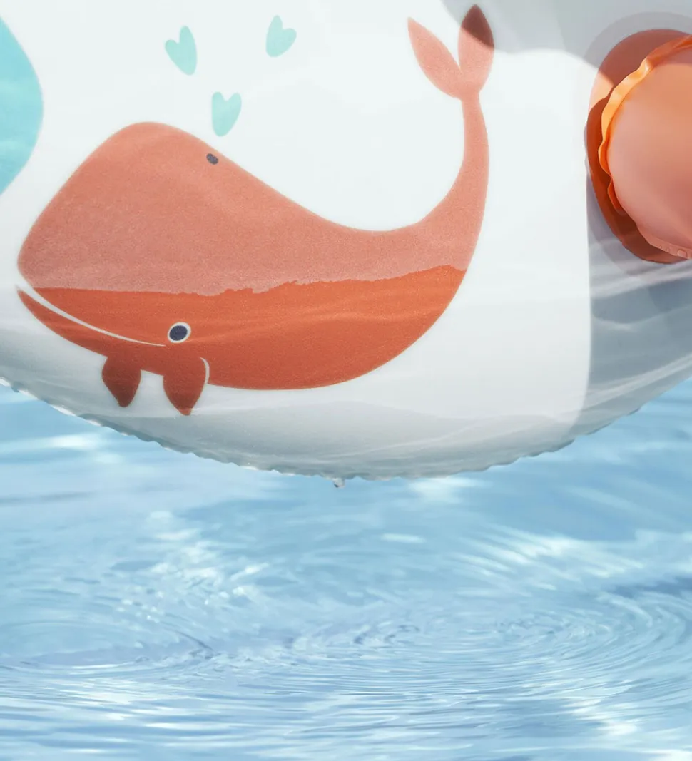 Bestway flyderen pustes op med en praktisk ventil, der kan trykkes ind i flyderen, så den ikke kommer til at genere legen i vandet. Solskærmen er aftagelig, og flyderen er lavet i et meget blødt og glat materiale.