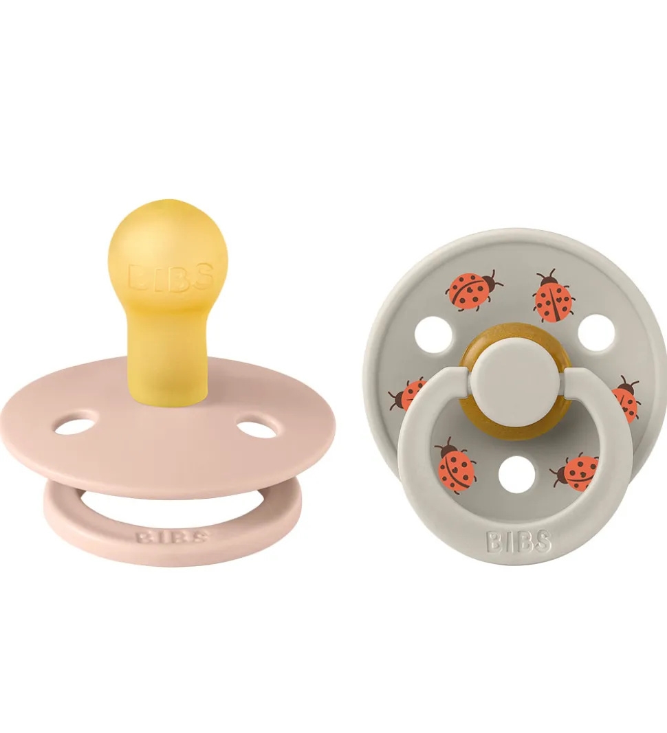 Søde BIBS sutter solgt i en 2-pak i rosa og gråbeige med print af mariehøns.