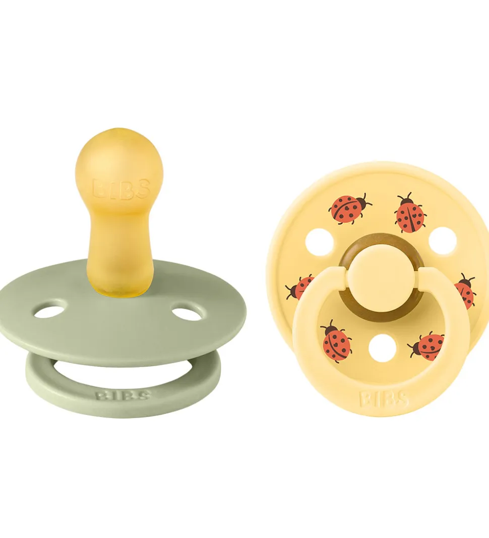 Søde BIBS sutter solgt i en 2-pak i gul og støvet grøn med print af mariehøns.