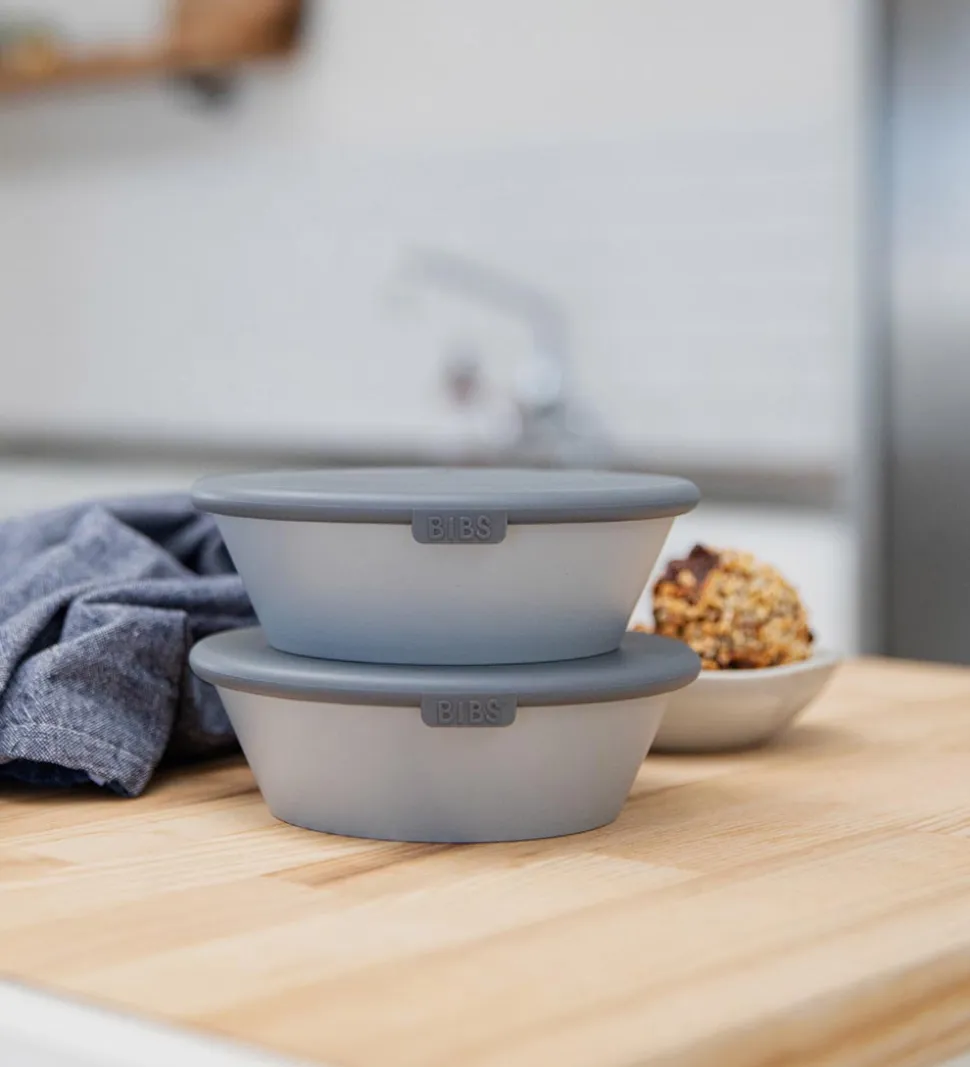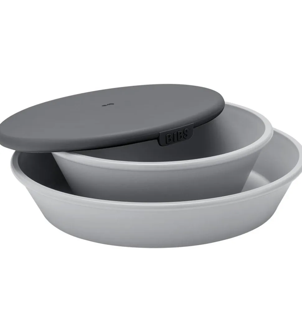 Smarte BIBS spisesæt solgt i en praktisk 3-pak, bestående af en tallerken og en skål med låg. Delene er i grå og mørkegrå.
