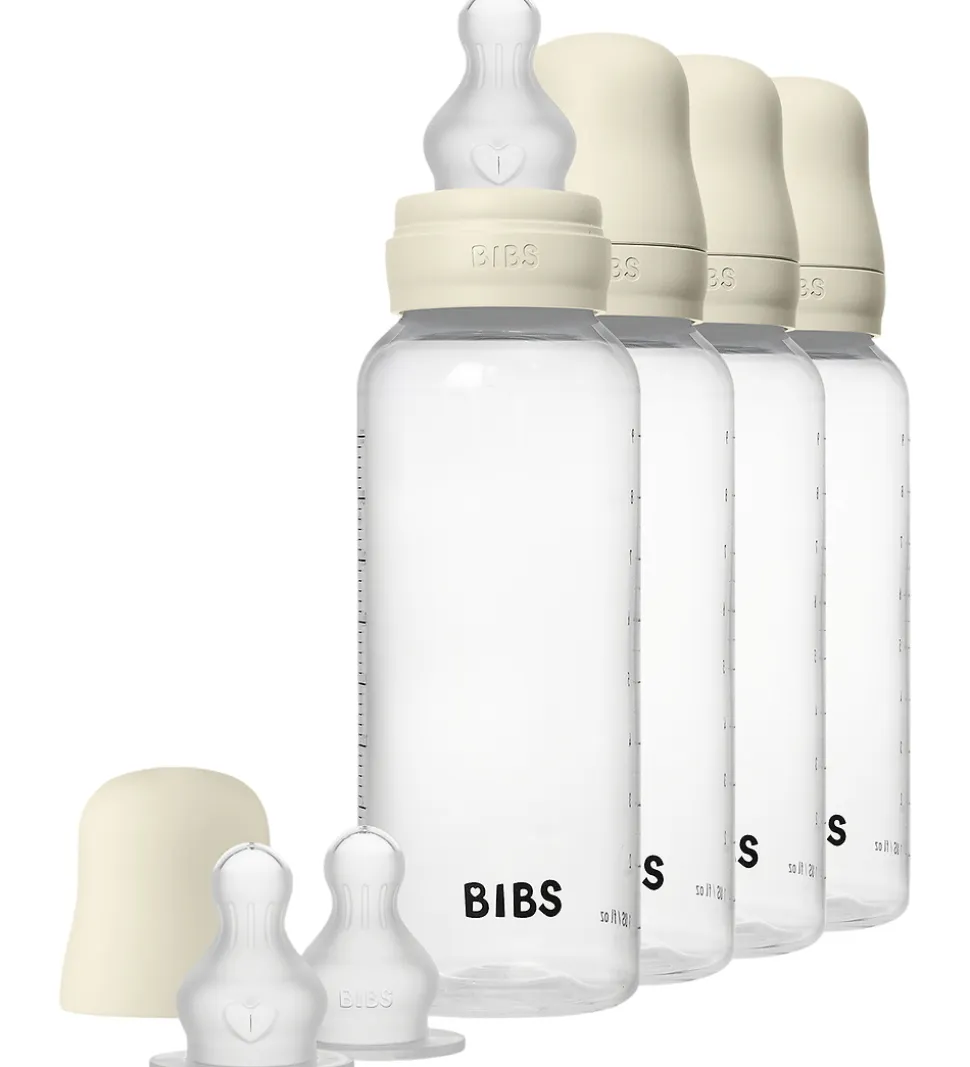 Smarte BIBS sutteflasker solgt i en 4-pak i cremehvid med en kapacitet på 270 ml. Sættet består af følgende udskiftelige dele: