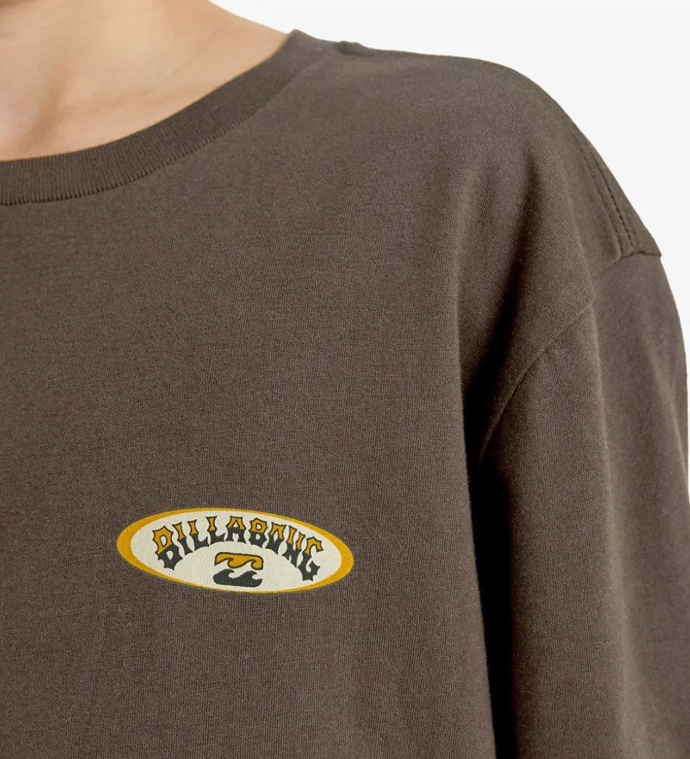 Sej Billabong bluse i mørkebrun med et grafisk logoprint i gul, hvid og grå på venstre bryst. På ryggen er det samme print i stor version. Blusen har en rund halsudskæring med en smal ribkant og lange ærmer med brede ribkanter.
