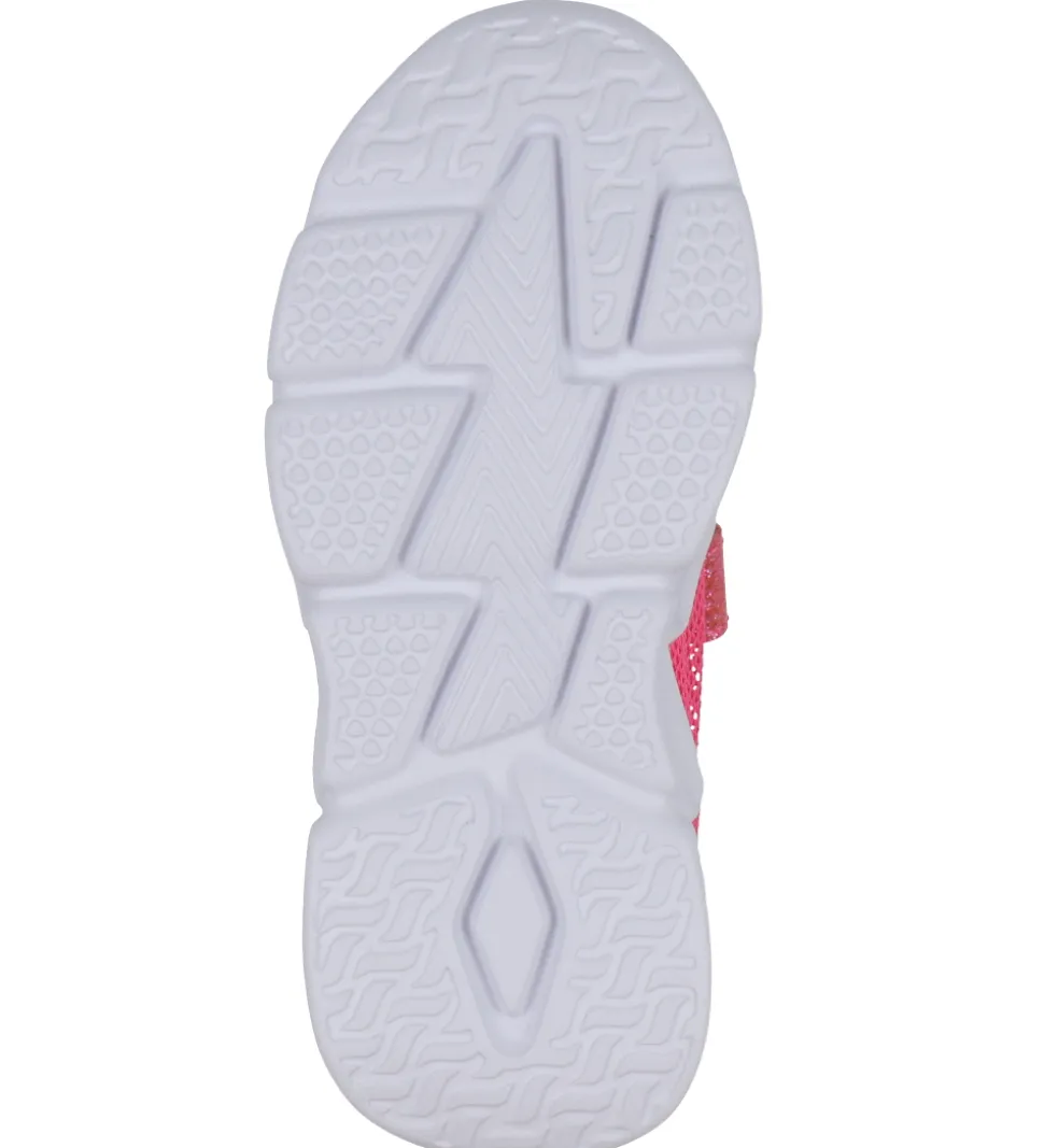 Fine Billieblush sandaler i pink mesh med detaljer i pink glimmer og med hvide ydersåler. Sandalerne har indbygget lilla LED-lys i ydersålerne, som aktiveres når man går. Lyset er ikke genopladeligt.