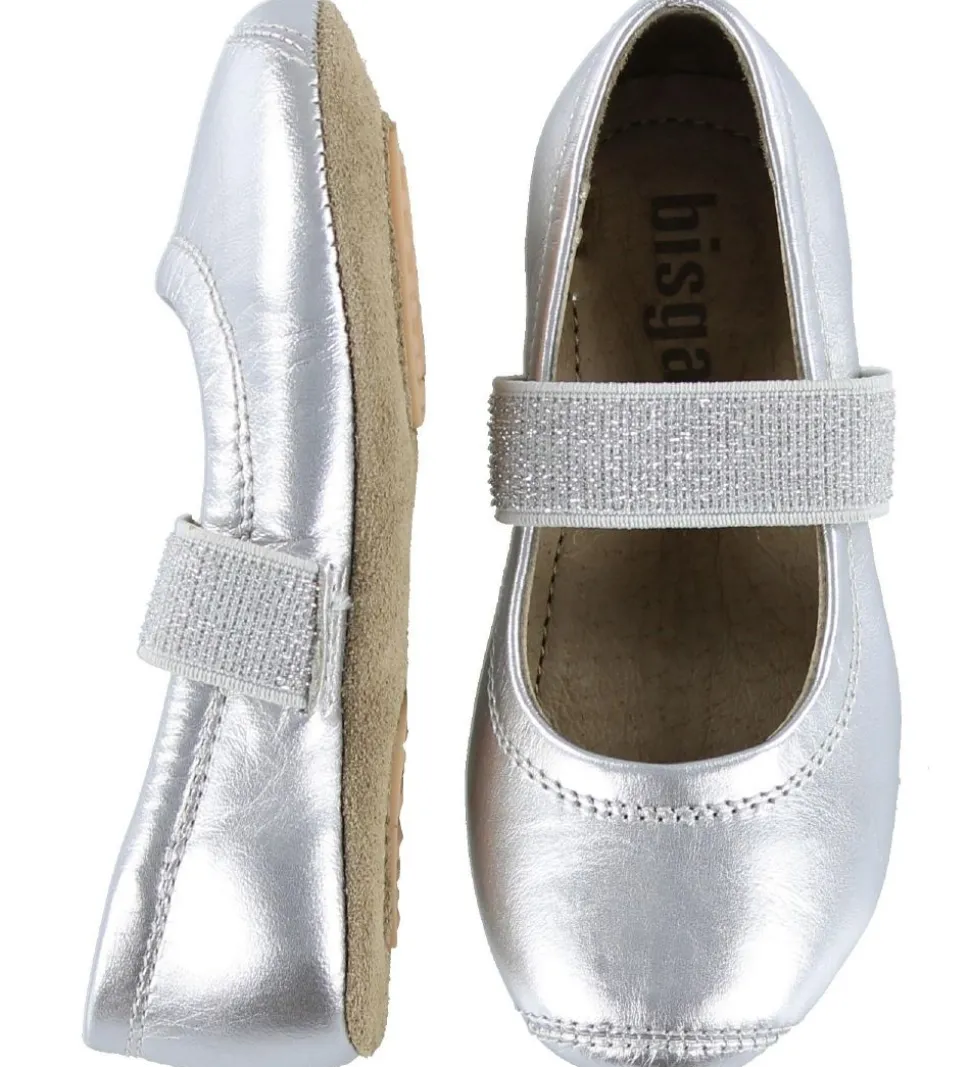 Hjemmeskoene er ensfarvet sølv med et sølvglimmer elastikbånd henover vristen.