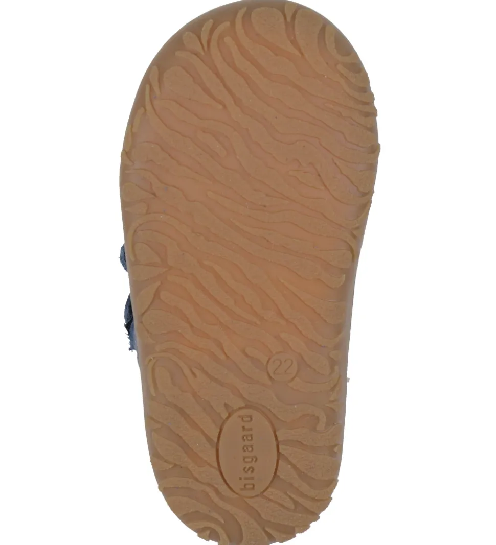 Bisgaard begynderskoene lukkes over vristen med to velcroremme, så de nemt kan tilpasses barnets fod. På indersiden er de foret med blød skind, og bagtil er der en fast hælkappe. Indersålen er blød og udtagelig.