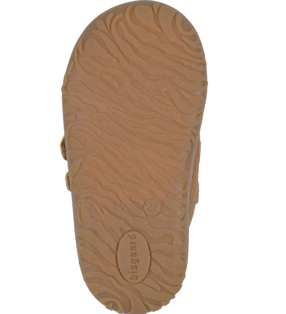 Bisgaard begynderskoene lukkes over vristen med to velcroremme, så de nemt kan tilpasses barnets fod. På indersiden er de foret med blød skind, og bagtil er der en fast hælkappe. Indersålen er blød og udtagelig.