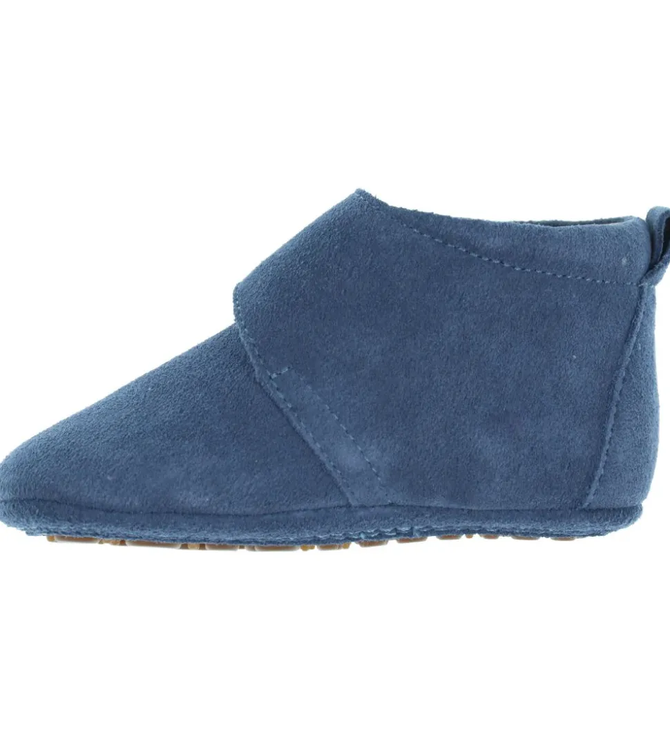 Smarte Bisgaard skindfutter i blåt ruskind, og yderst på velcroremmen sidder der en messingfarvet metalstjerne.